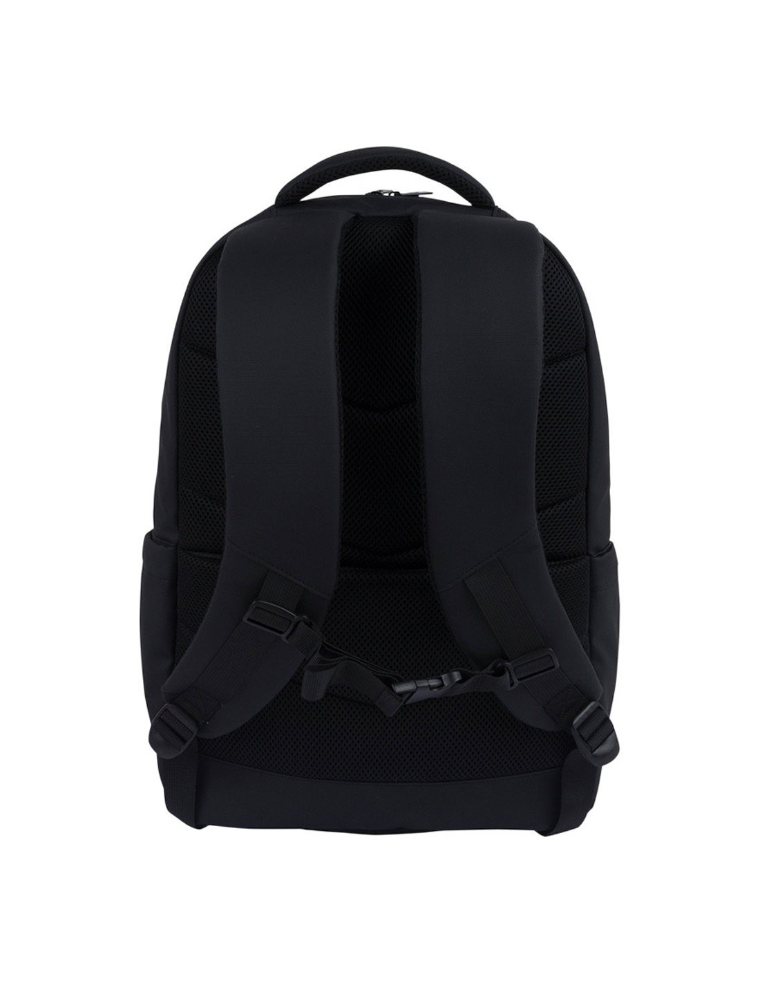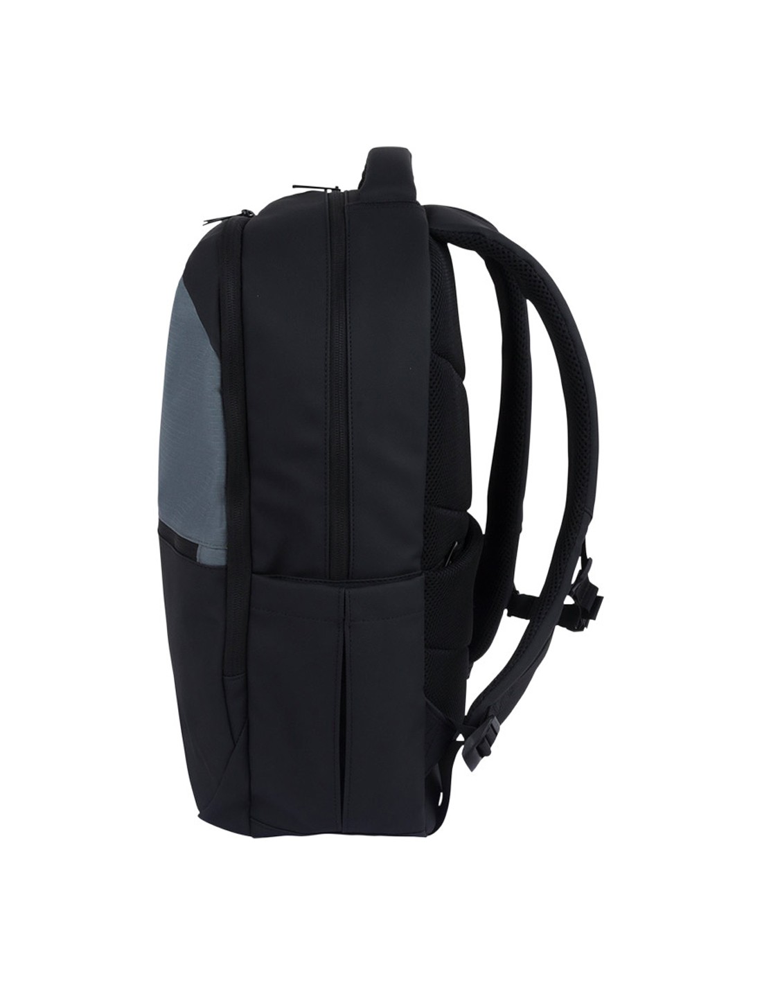 Sac à dos ordinateur en polyester enduit et ripstop. 2 compartiments zippés, 2 poches intérieures plaquées, 3 porte-stylos et lien avec mousqueton. 2 poches avant zippées. 2 poches gourde. Poche zippée cachée au dos. Sangle poitrine et bretelles ajustables, dos moussé. Pieds de renfort. Pochette moussée pour ordinateur 15,6''. Accessoires métal noirs. Dimensions : 47 x 33 x 14,5 cm. Coloris noir/gris.