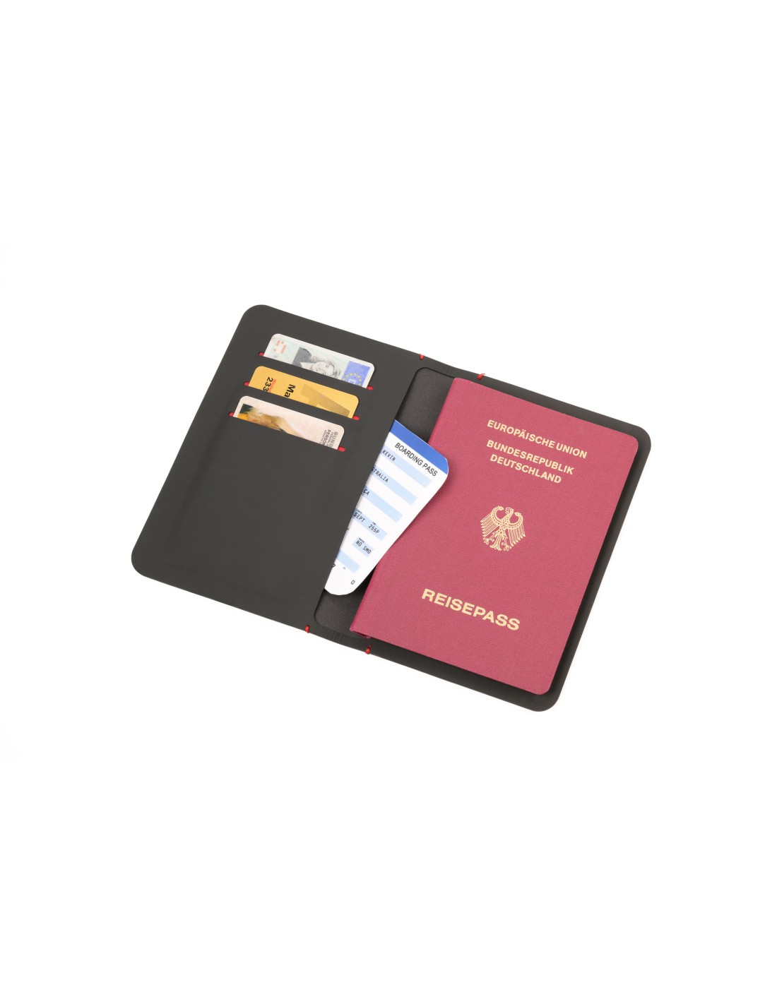Protège-passeport et étui pour cartes de crédit, 2 grandes poches pour, par exemple, le passeport, la carte d'embarquement et les billets de banque, 3 compartiments à cartes avec prévention de la fraude (pour les puces RFID), étui soudé sans soudure, surface antibactérienne, similicuir, noire/rouge