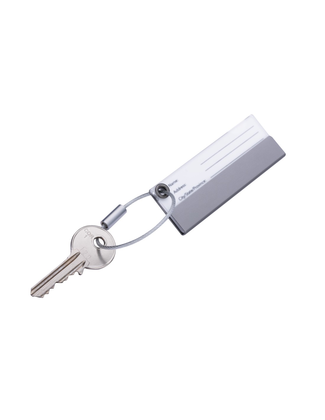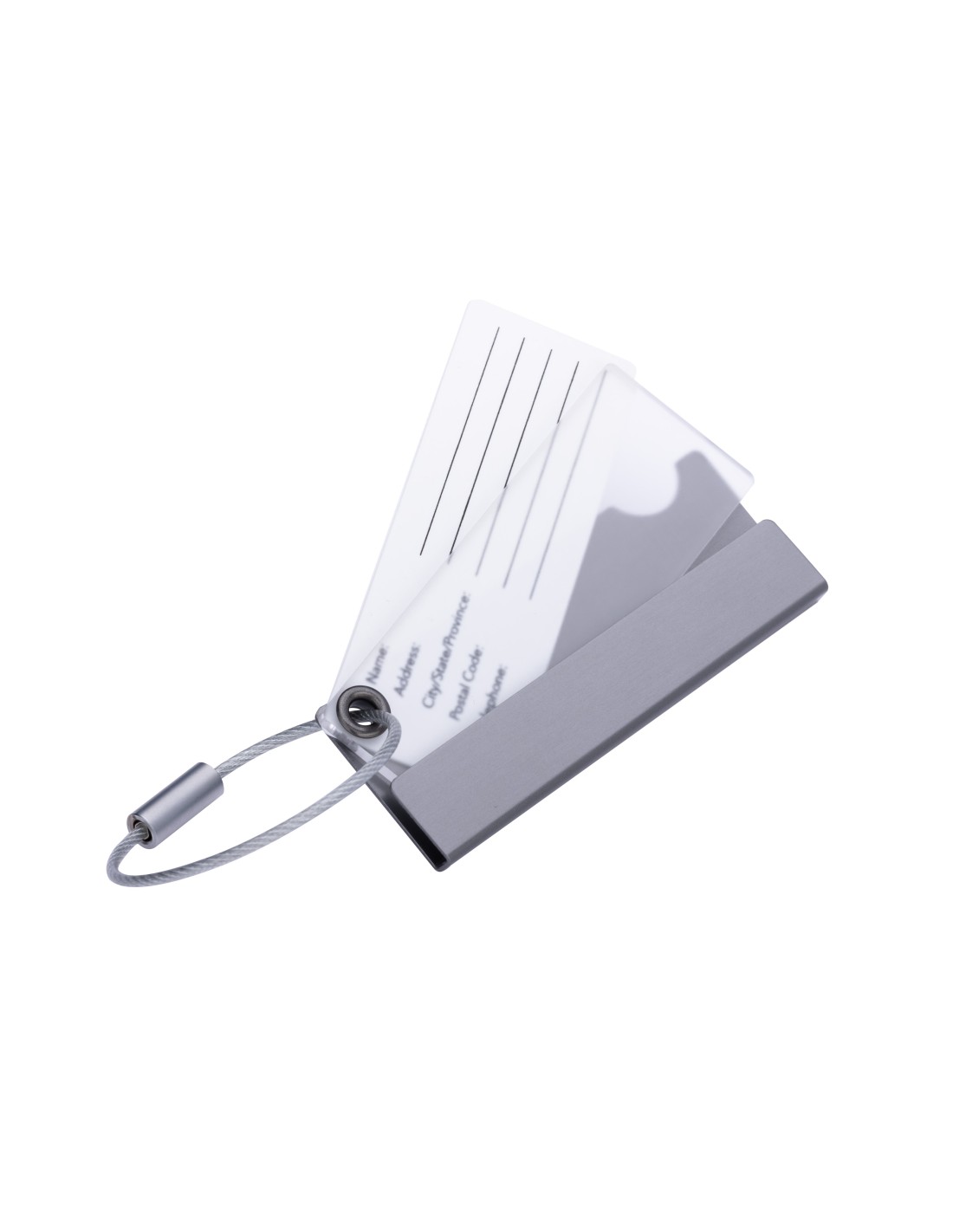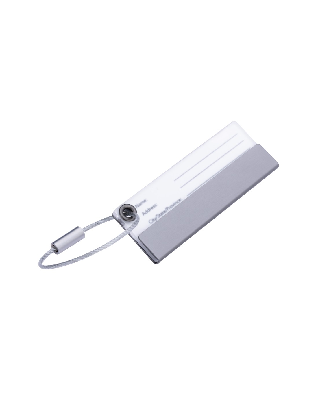 Étiquette de valise avec champ d'adresse pour l'inscription, boucle de fil de fer incluse pour la fixation, aluminium, verre acrylique, mat, argenté