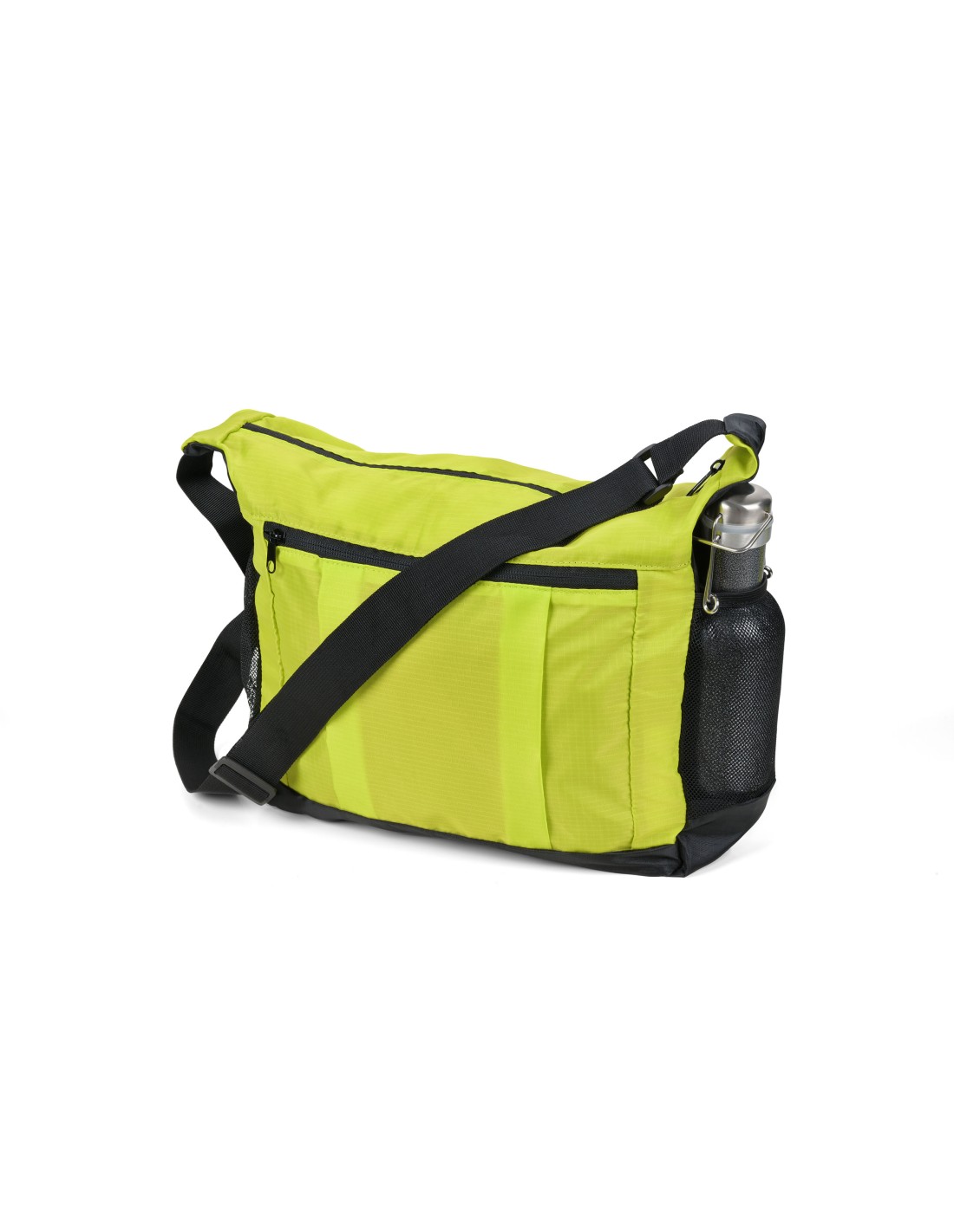 Sac à bandoulière pliable (se range dans le compartiment intérieur pour gagner de la place) avec mousqueton pour une fixation rapide, grand compartiment principal zippé, petit compartiment intérieur zippé, compartiment extérieur zippé, 2 poches en filet pour bouteille et parapluie, bretelles réglables en longueur, capacité de charge jusqu'à 10 kg, polyester, vert