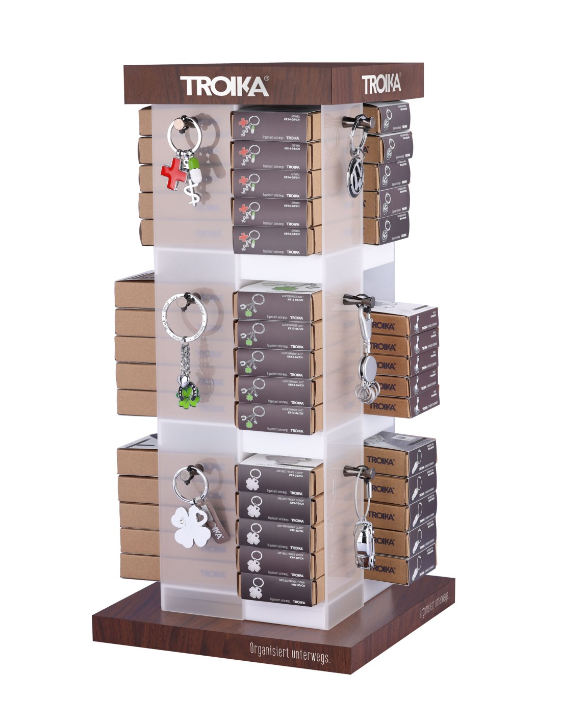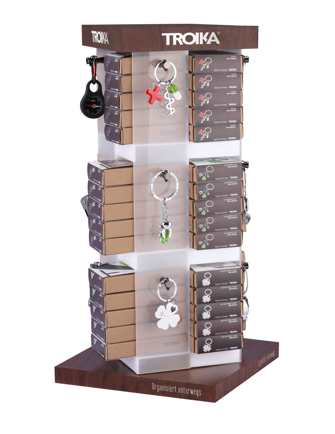 Présentoir de comptoir pour le libre-service, quatre côtés, pied carré, pour la présentation de 12 porte-clés avec 5 pièces chacun en stock, par porte-clé une surface d'échantillon de présentation avec crochet de sécurité, pivotant à 360°, acrylique, mat, marron/blanc/transparent