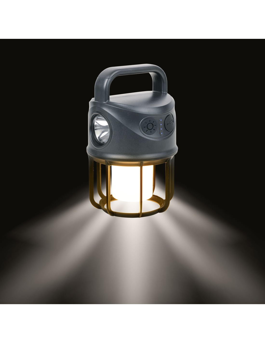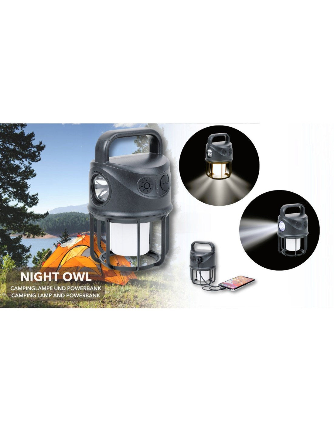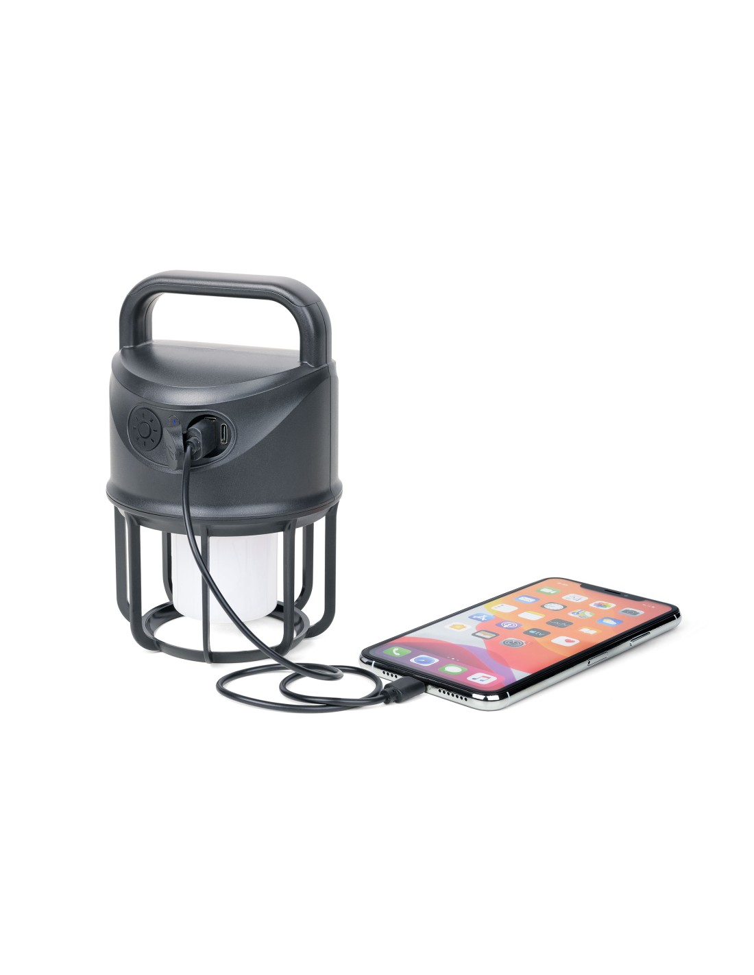Lampe de camping et banque de puissance, rechargeable, avec trois modes d'éclairage différents (à intensité variable) et fonction clignotante, blanc froid (250 lm), blanc chaud (160 lm), lampe de poche (150 lm), 4000 mAh en entrée, 5V en sortie, affichage de l'état de la batterie par LED, câble de chargement USB-C inclus, port USB-A pour charger des appareils externes, protégées contre les projections d'eau (degré d'étanchéité IPX4), plastique, mat, noir