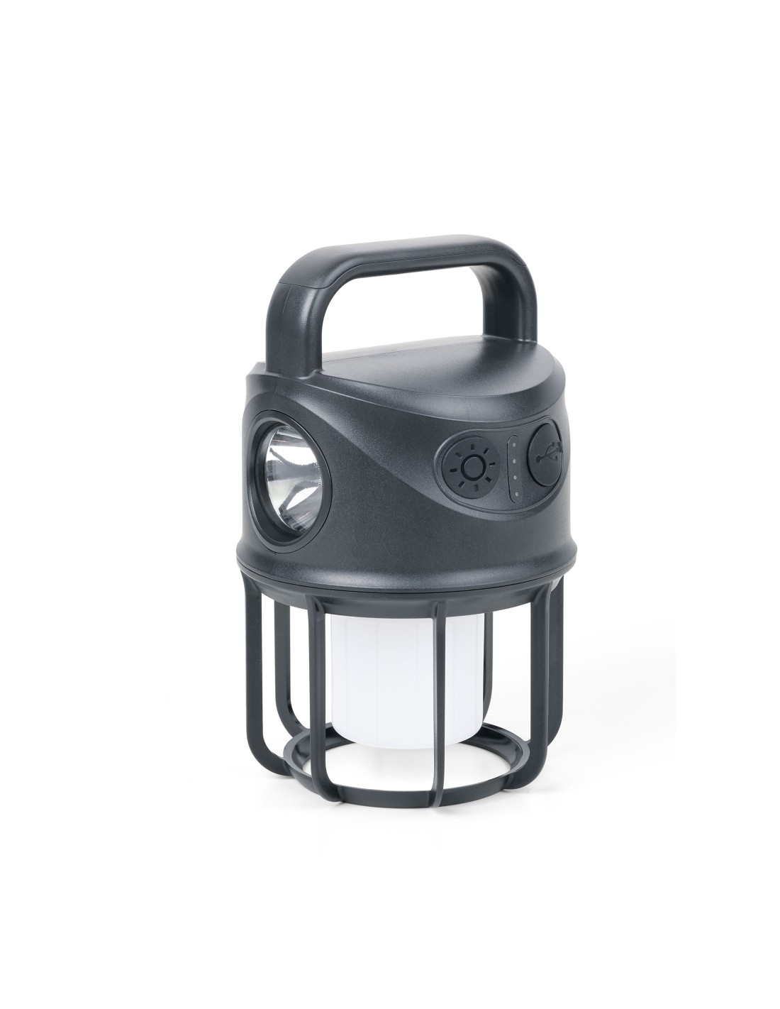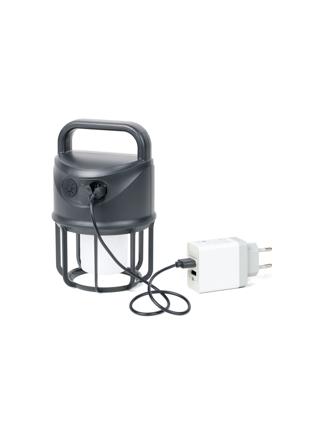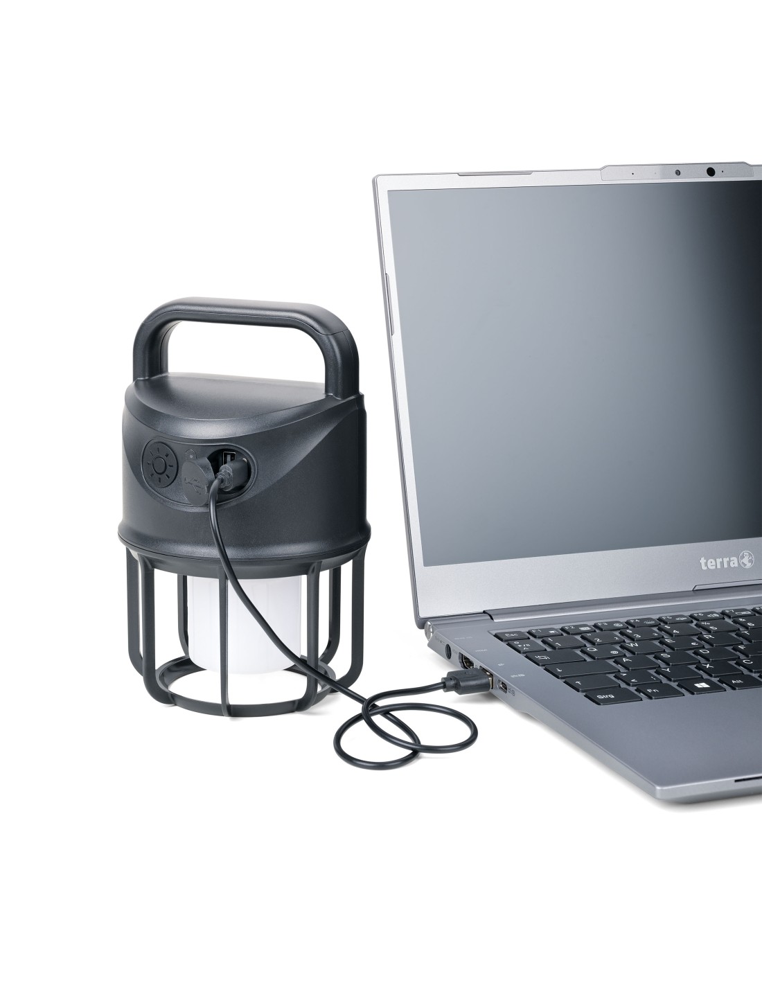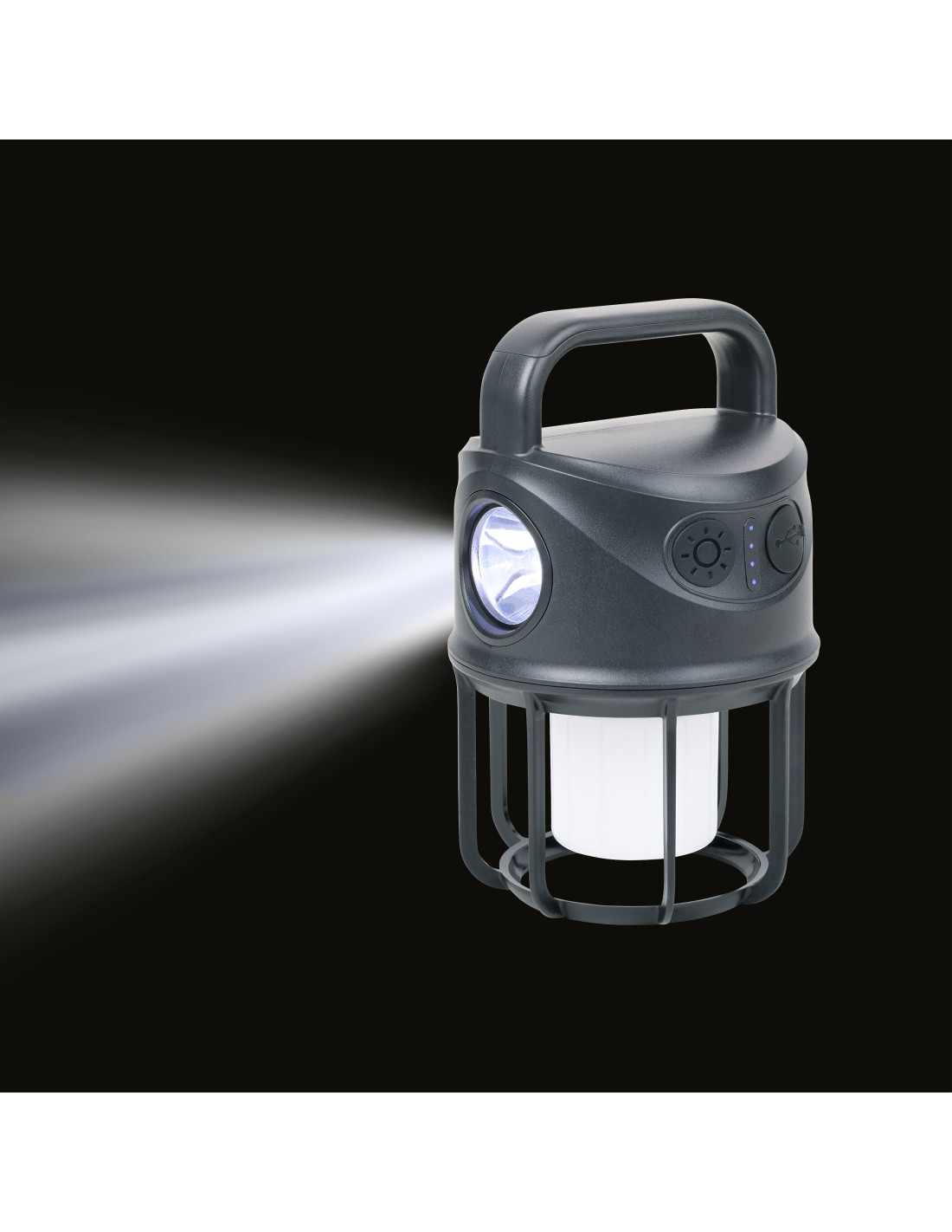 Lampe de camping et banque de puissance, rechargeable, avec trois modes d'éclairage différents (à intensité variable) et fonction clignotante, blanc froid (250 lm), blanc chaud (160 lm), lampe de poche (150 lm), 4000 mAh en entrée, 5V en sortie, affichage de l'état de la batterie par LED, câble de chargement USB-C inclus, port USB-A pour charger des appareils externes, protégées contre les projections d'eau (degré d'étanchéité IPX4), plastique, mat, noir