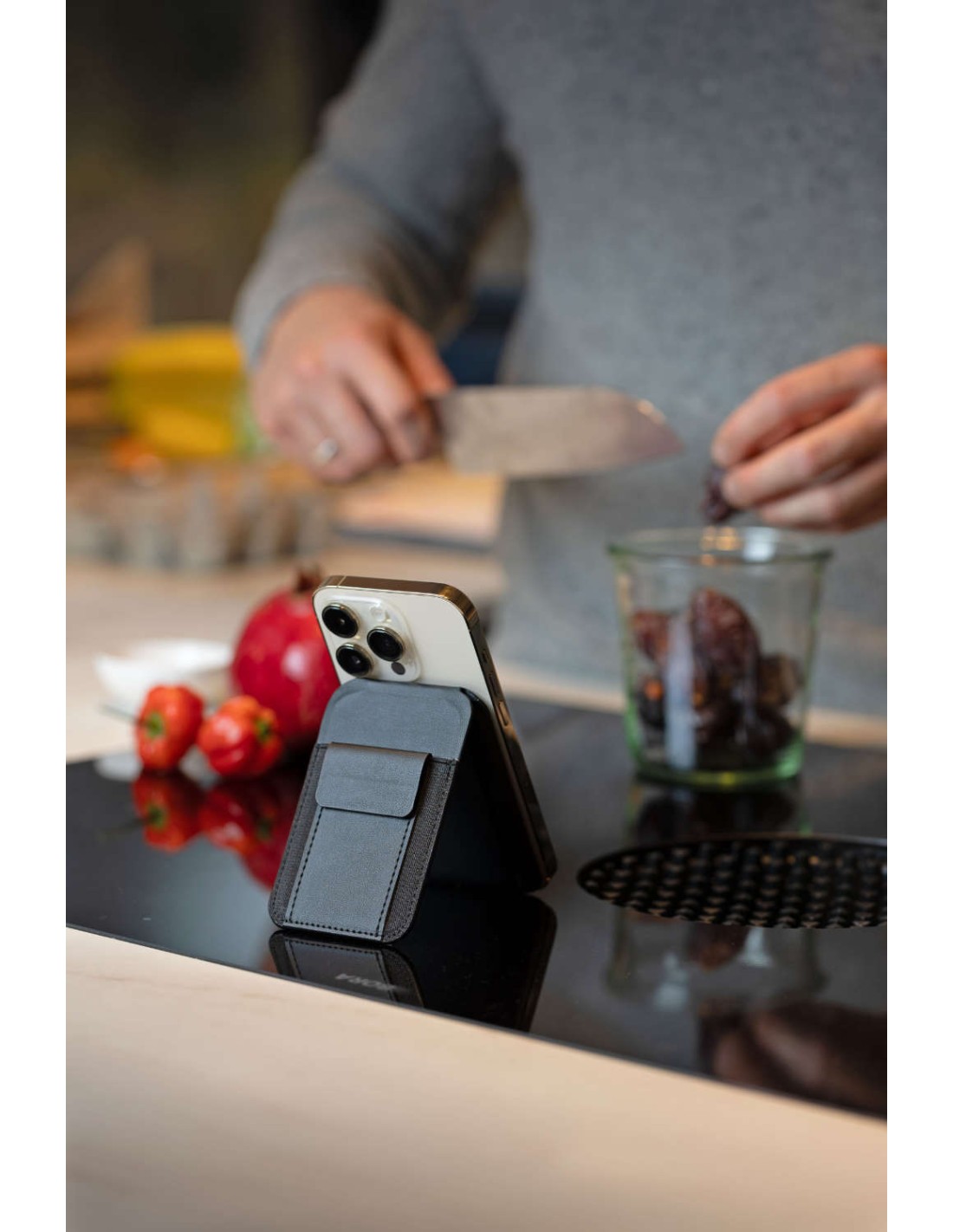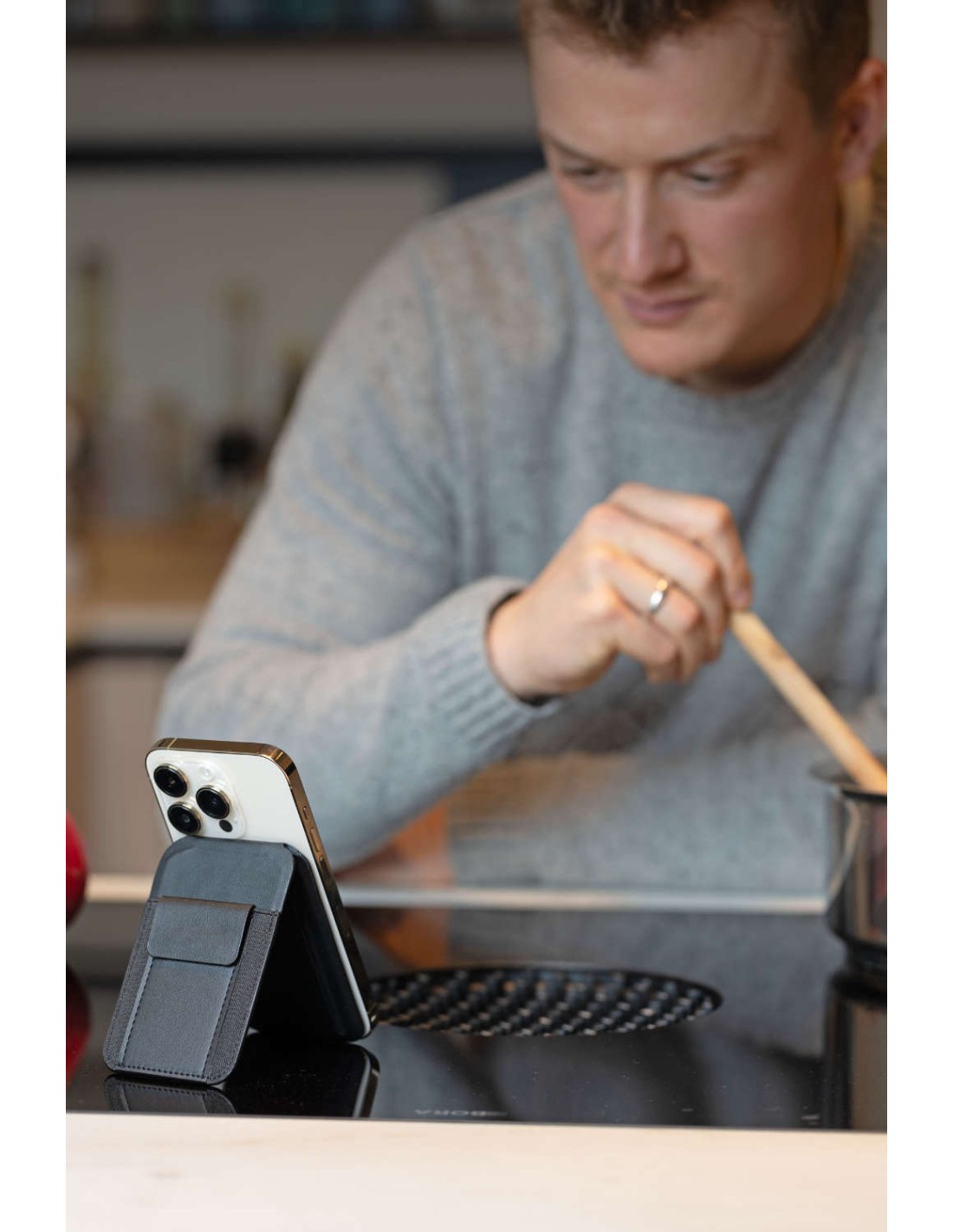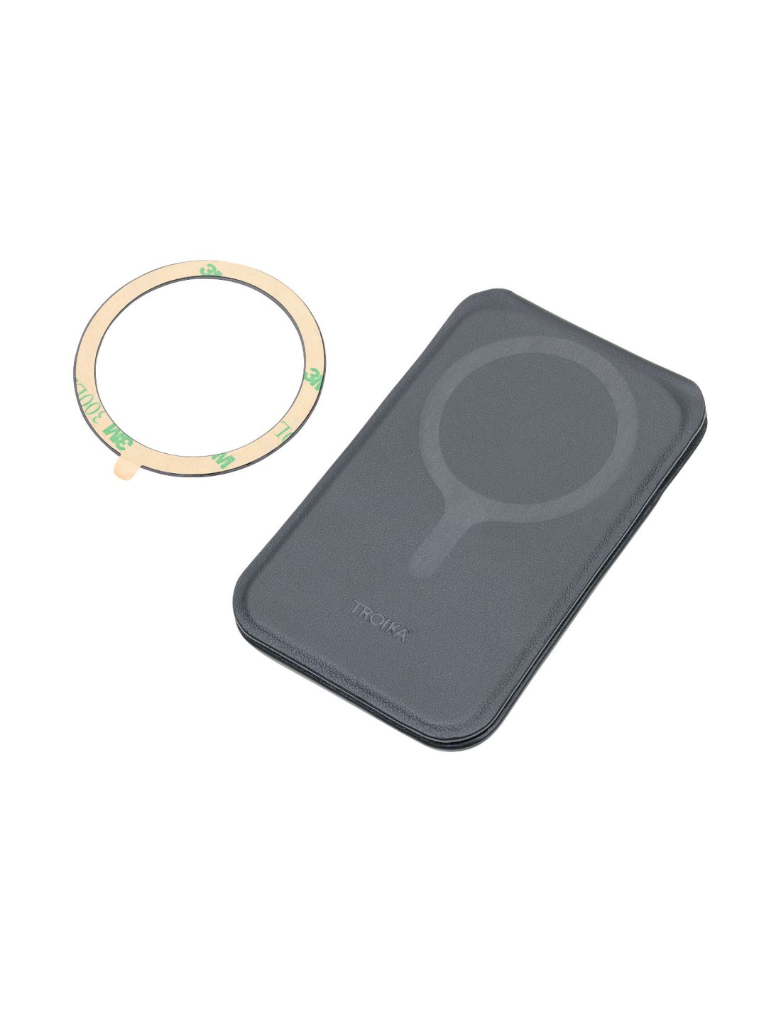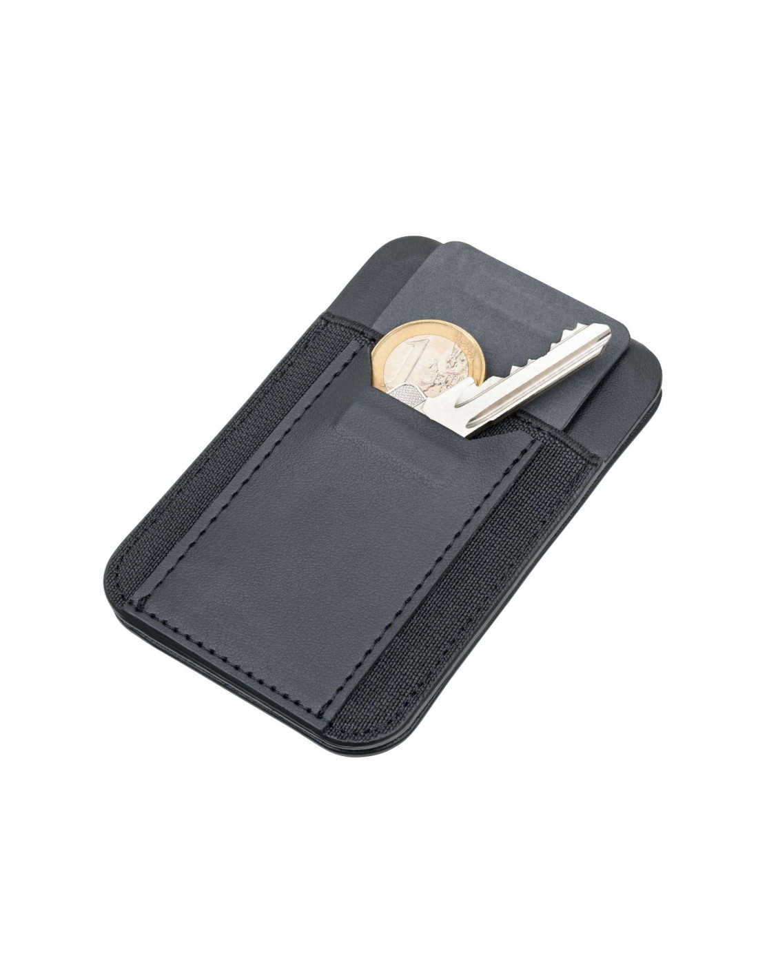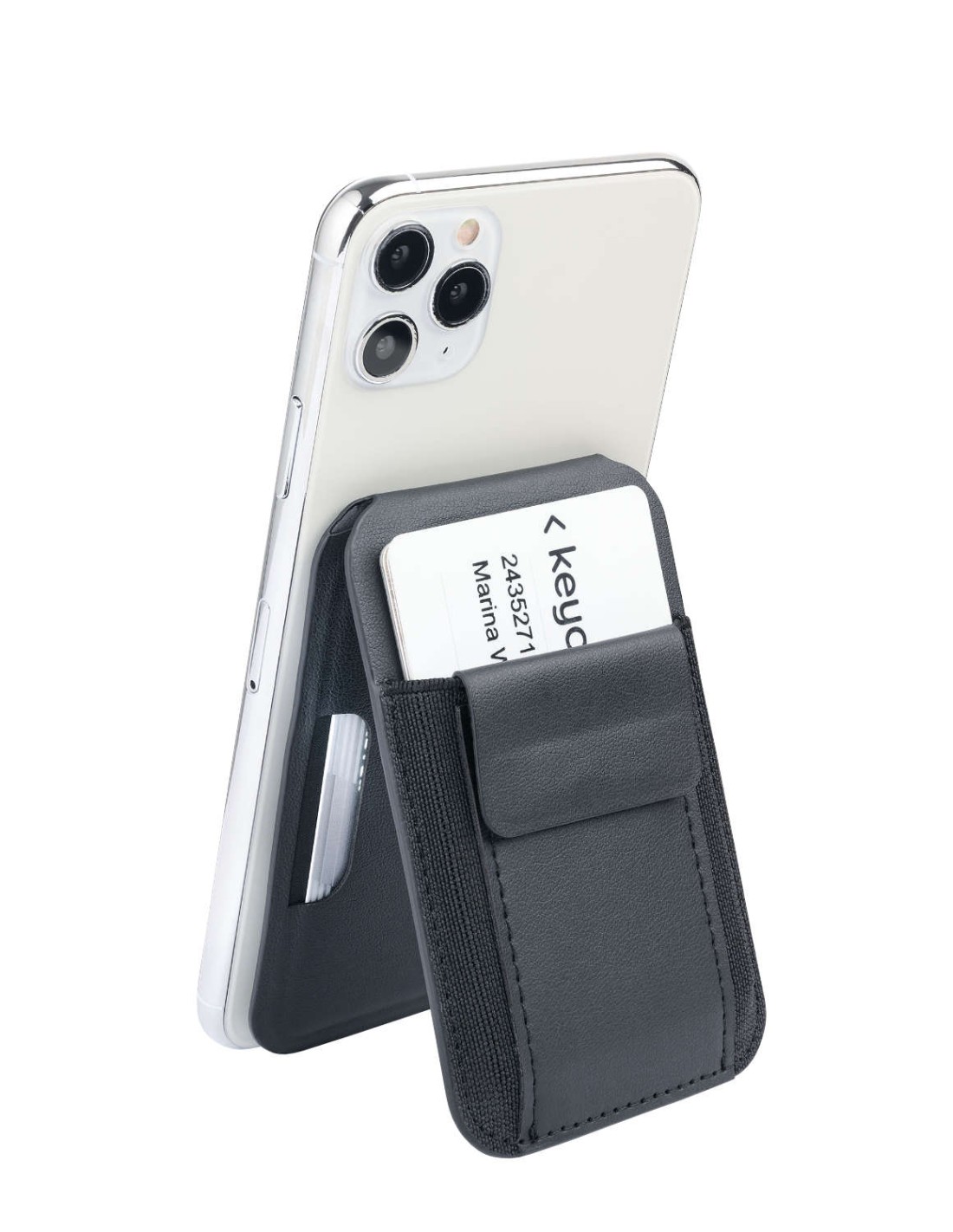 Étui pour cartes MagSafe, poche extensible pour 2-5 cartes, poche pour clés, poche pour 1 carte de crédit à l'intérieur, poche pour billets de banque, fixation magnétique par aimant N52 sur le smartphone, fonctions de redressement pour une mise à l'horizontale et à la verticale du smartphone, anneau métallique supplémentaire avec bande adhésive 3M pour la fixation sur tous les smartphones courants, carnets de notes, etc., 100% PU, métal, polyuréthane, noire