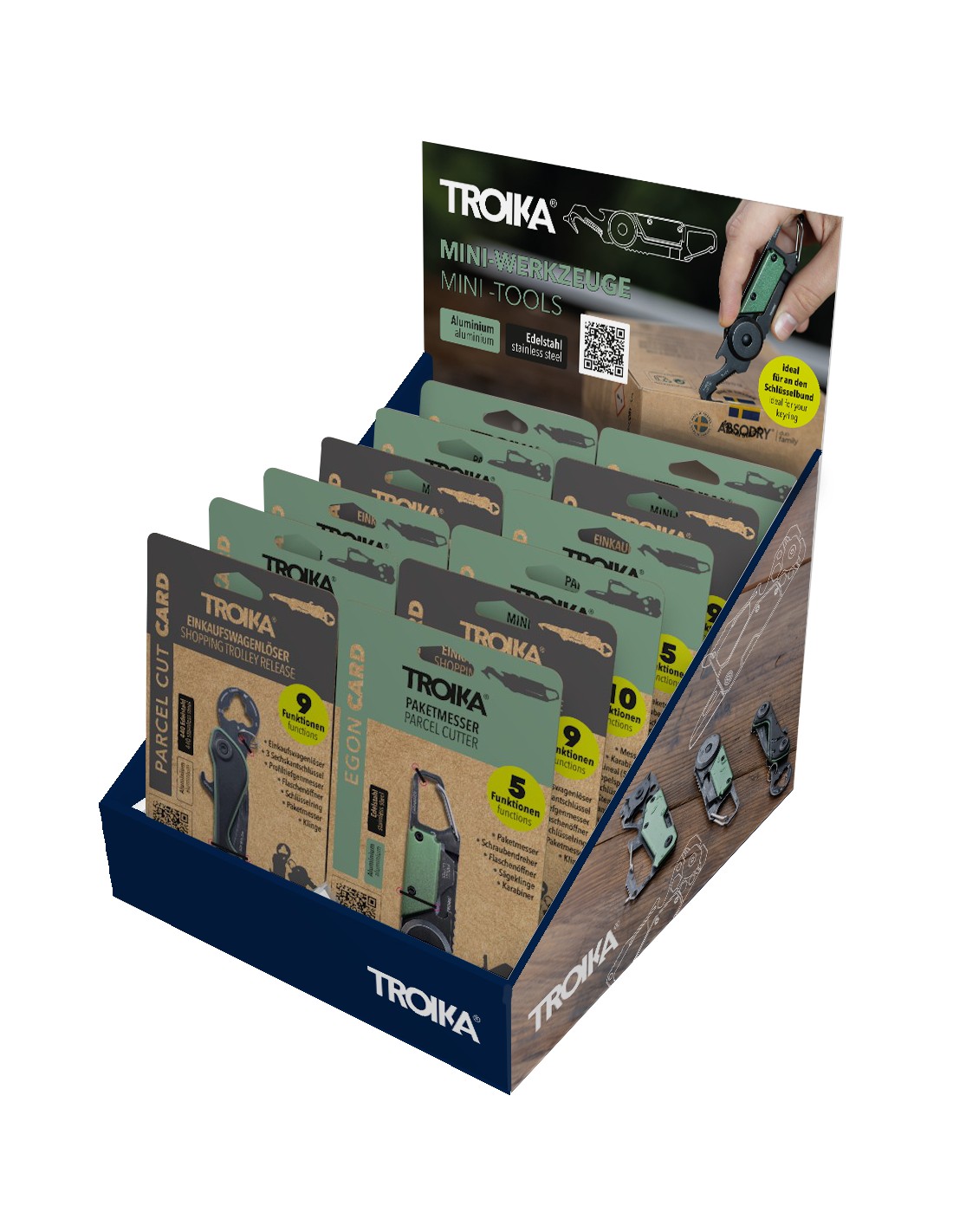 Présentoir de comptoir y compris 12 x KEYTOOL mini-outils avec 11 fonctions, pré-triés (12 x KTL40/GY), en libre-service, carton, imprimé, mat, multicolore
