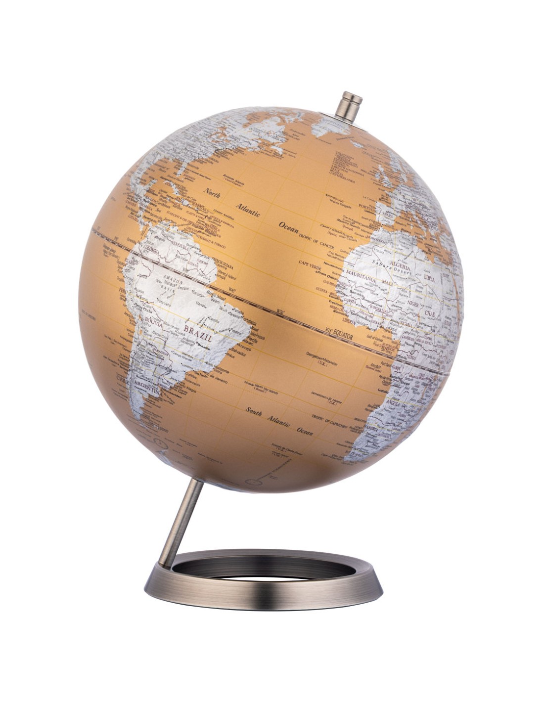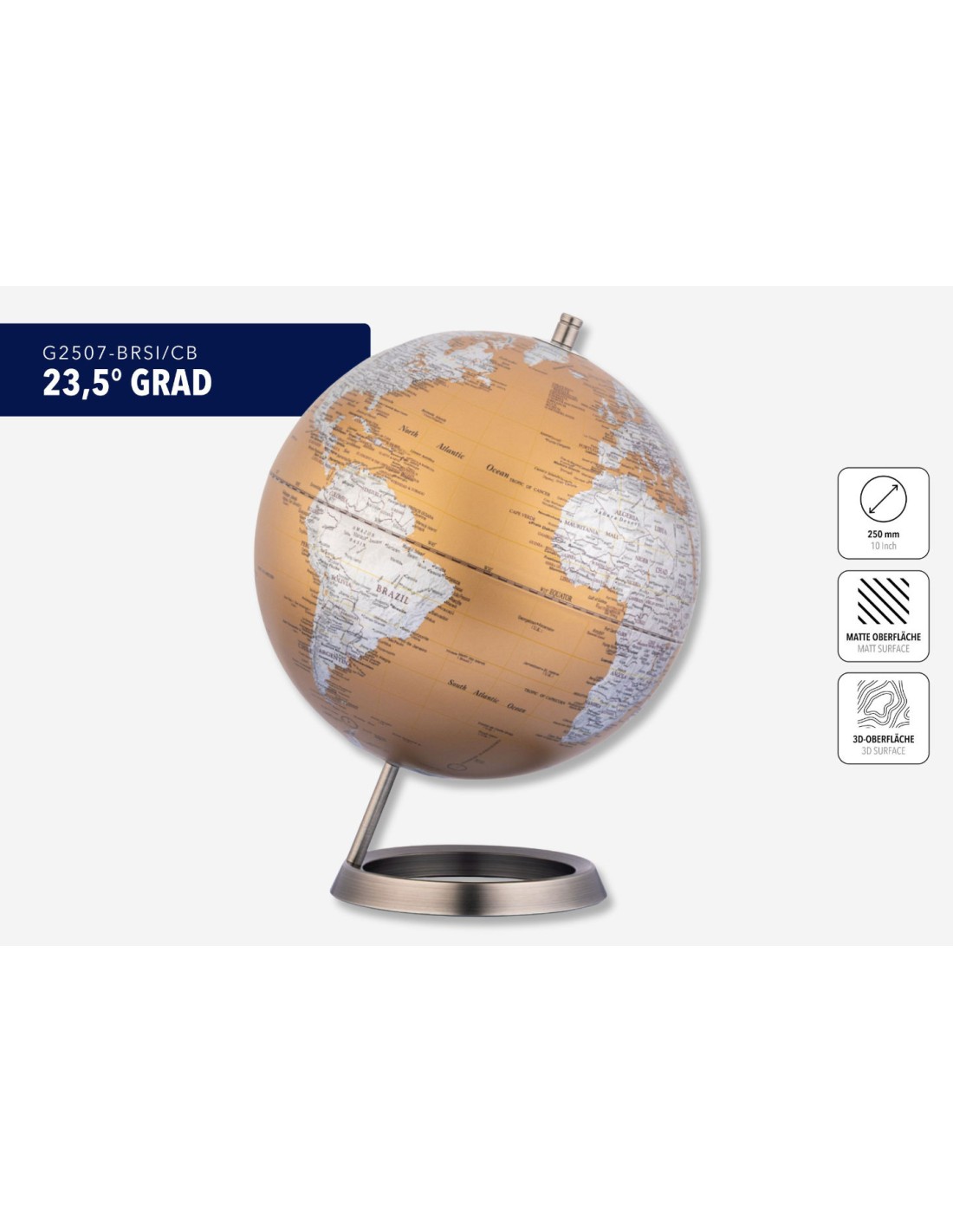 Globe avec un diamètre de 25 cm, pied métallique chromé d'aspect brossé, 23,5 degrés d'inclinaison sur l'axe mobile, relief de la carte, métal, plastique, mat, argenté/couleur bronze