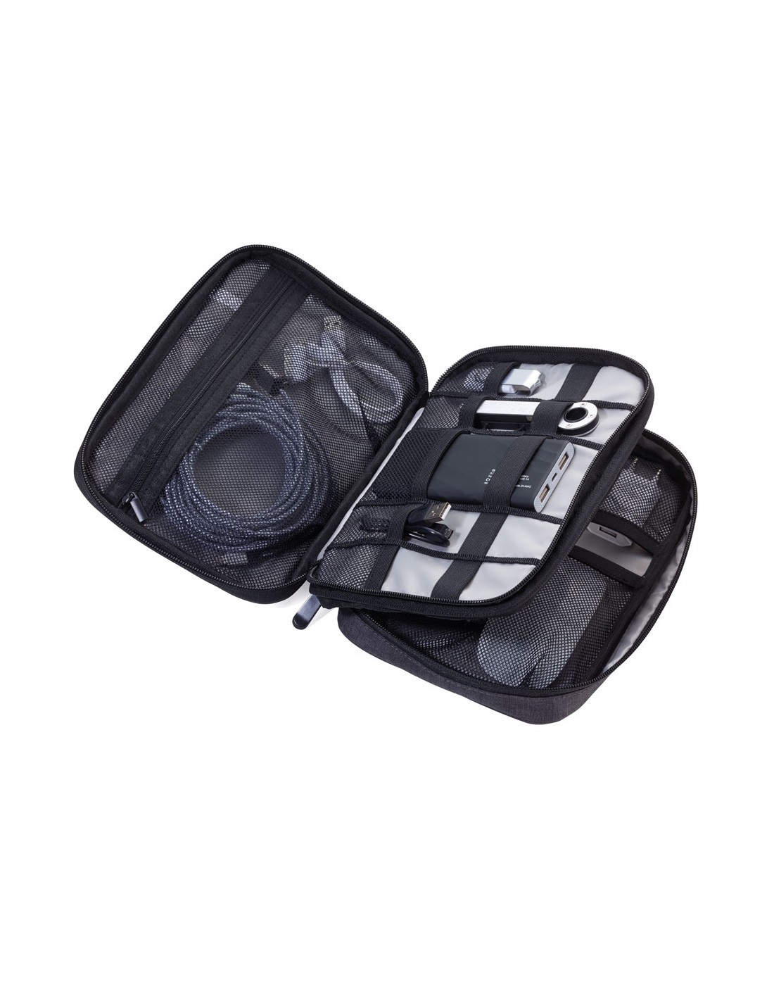 Pochette pour câbles avec 2 pochettes fermeture à glissière, 2 poches intérieures avec poches à filet et bande élastique pour accessoires (Every Day Carry), boucle à stylo, 1 compartiment extérieure, boucle pour fixer sur un chariot, polyester, noire