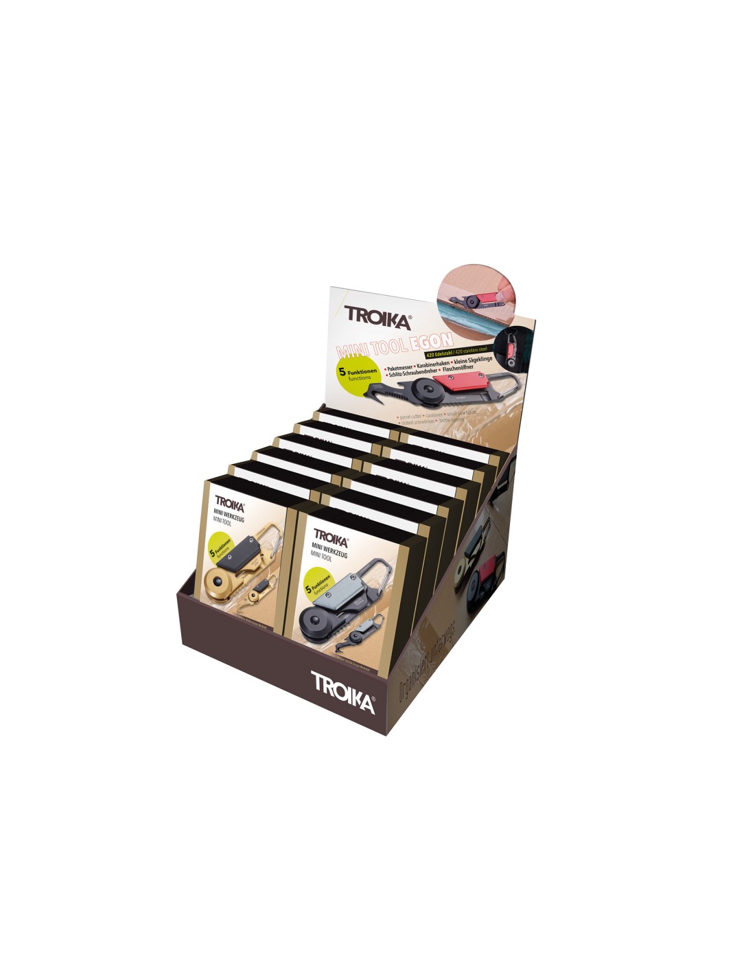 Présentoir de comptoir incl. 12 x EGON mini-outil (KTL26/..), prétrié (chacun 4 x KTL26/GO, ../RD, ../TI), en libre-service, carton, imprimé, mat, multicolore