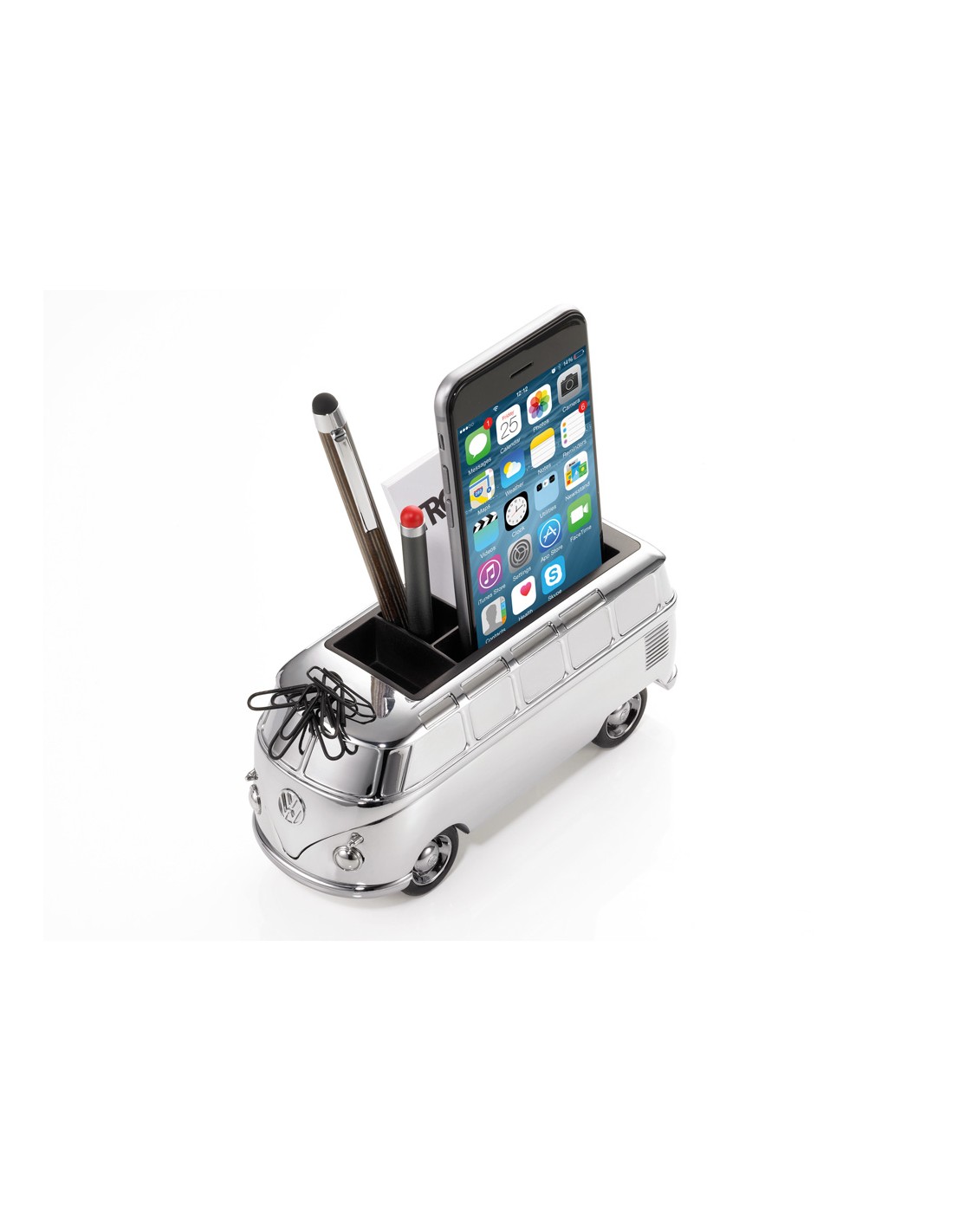 Porte-crayons et article de bureau, VW Combi (T1, Samba bus, 1962), moteur à rétro-friction, compartiment intégré pour smartphones, compartiment intégré pour cartes de visite, aimant pour les trombones, incl. 5 trombones, fonte métallique, chrome, brillant, argenté/noire