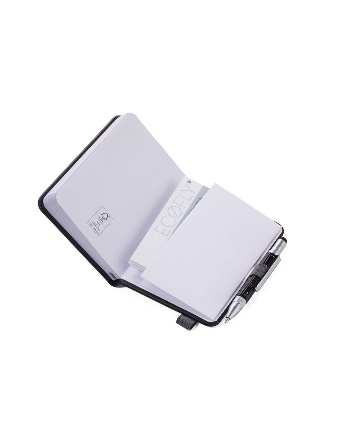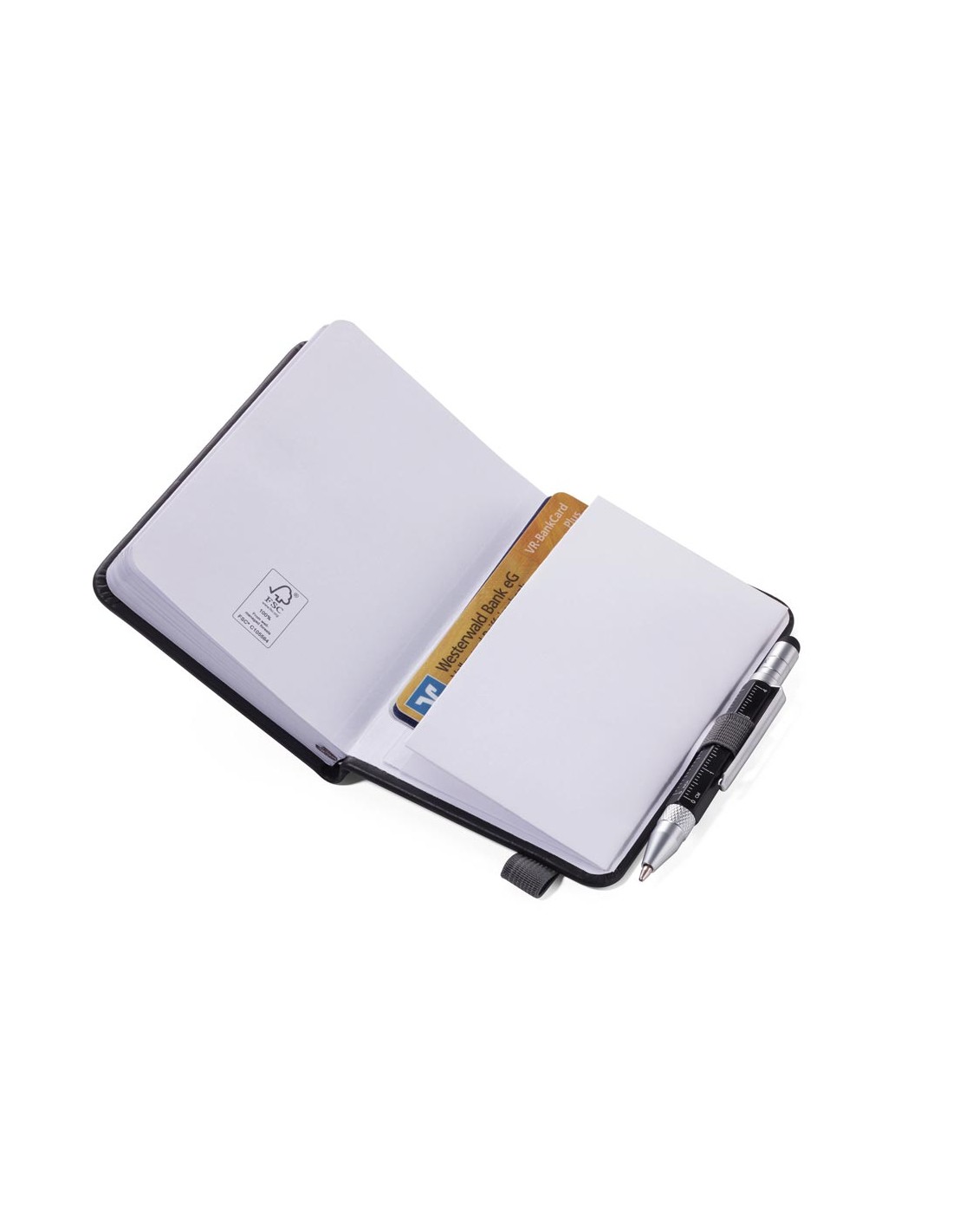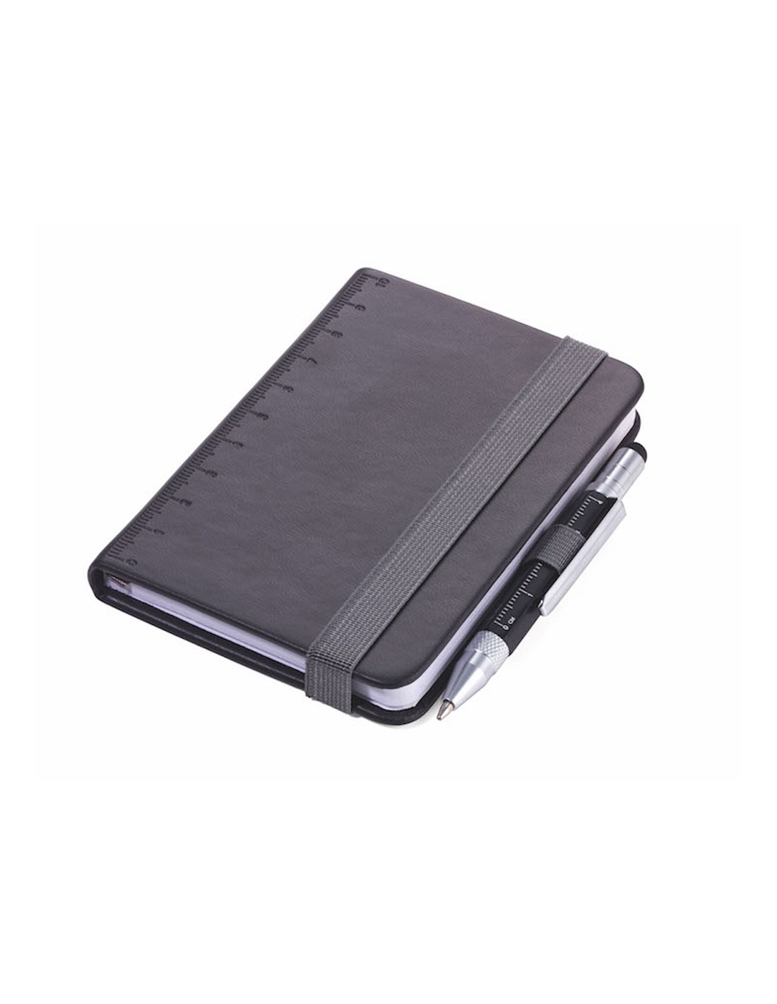 Bloc-notes DIN A7 incl. stylo à bille, fermeture à bande élastique, boucle de stylo, signet, règle en relief (10 cm) sur couverture, papier certifié FSC, côtés perforés, matrice de points, compartiment pour les documents, stylo à bille multitâche CONSTRUCTION LILIPUT (petit), mine noire, métal, similicuir, mat, noire