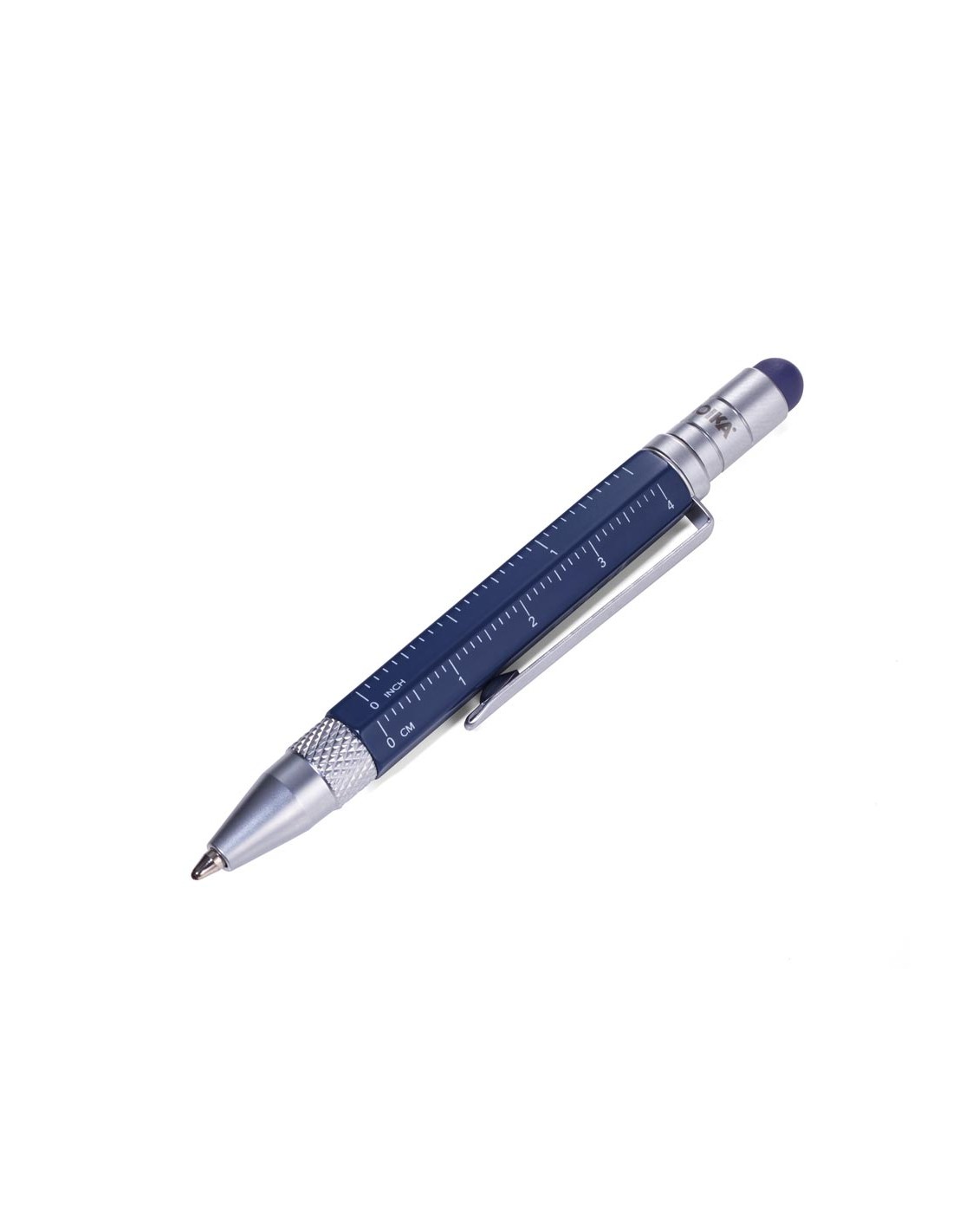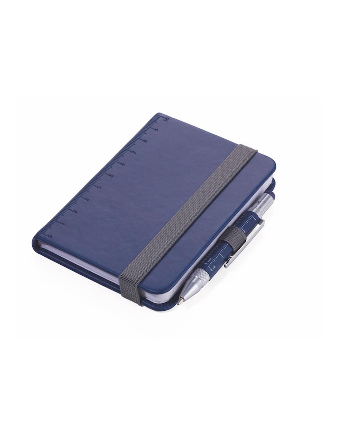 Bloc-notes DIN A7 incl. stylo à bille, fermeture à bande élastique, boucle de stylo, signet, règle en relief (10 cm) sur couverture, papier certifié FSC, côtés perforés, matrice de points, compartiment pour les documents, stylo à bille multitâche CONSTRUCTION LILIPUT (petit), mine noire, métal, similicuir, mat, bleu foncé