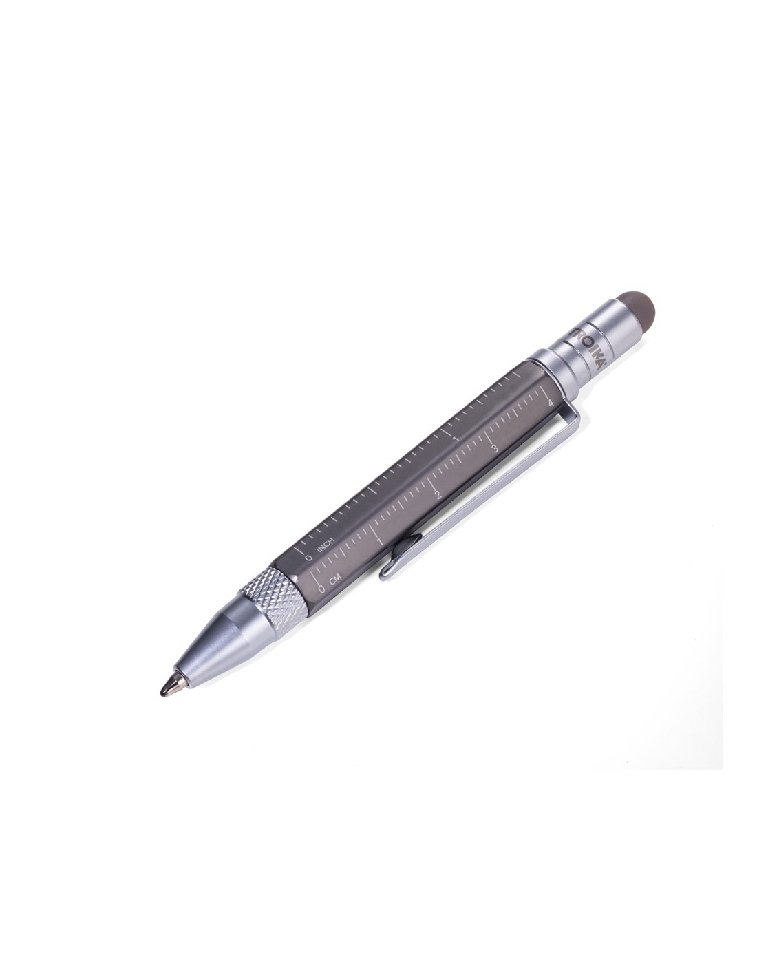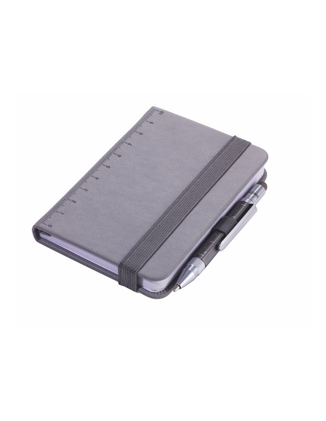Bloc-notes DIN A7 incl. stylo à bille, fermeture à bande élastique, boucle de stylo, signet, règle en relief (10 cm) sur couverture, papier certifié FSC, côtés perforés, matrice de points, compartiment pour les documents, stylo à bille multitâche CONSTRUCTION LILIPUT (petit), mine noire, métal, similicuir, mat, gris