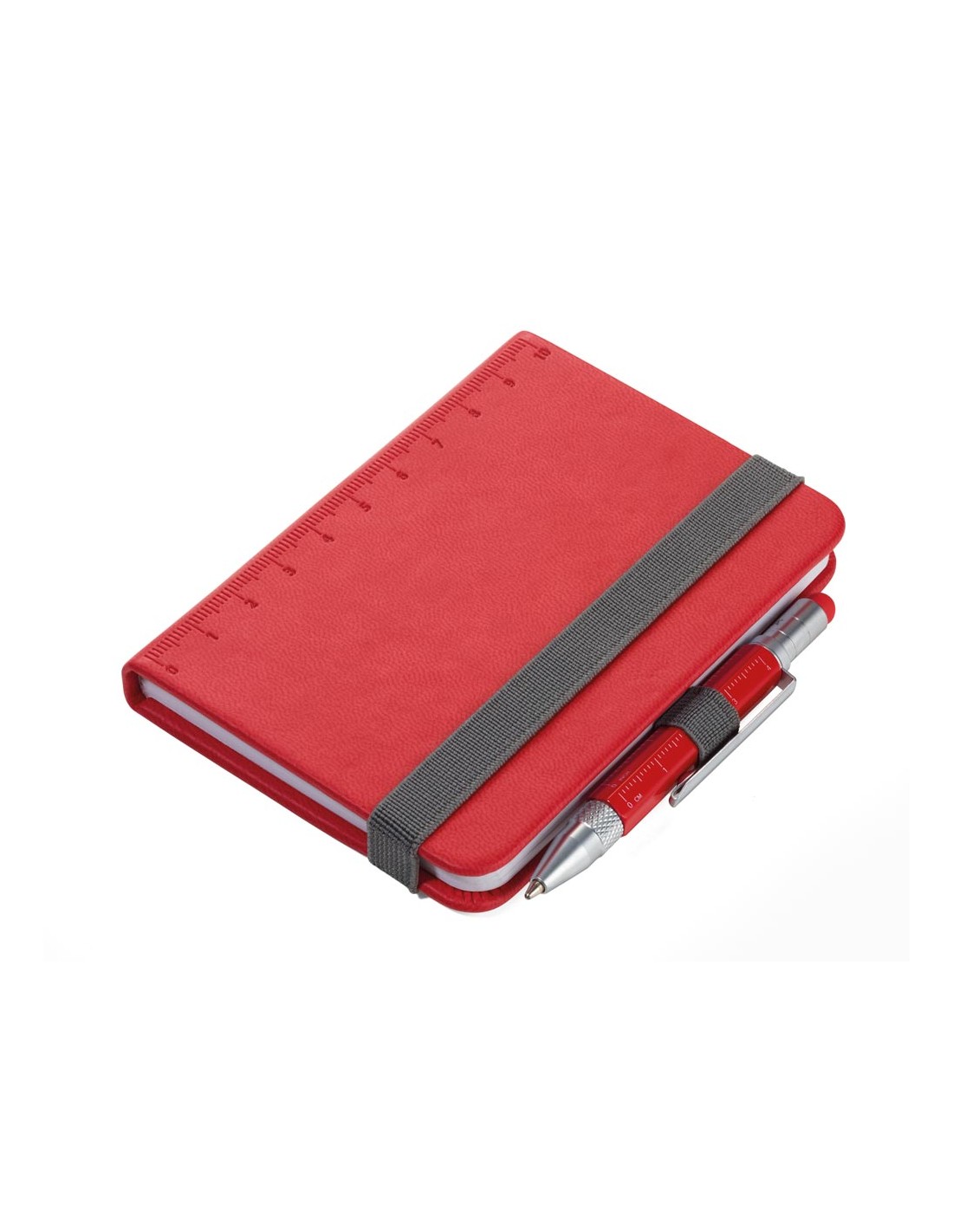 Bloc-notes DIN A7 incl. stylo à bille, fermeture à bande élastique, boucle de stylo, signet, règle en relief (10 cm) sur couverture, papier certifié FSC, côtés perforés, matrice de points, compartiment pour les documents, stylo à bille multitâche CONSTRUCTION LILIPUT (petit), mine noire, métal, similicuir, mat, rouge