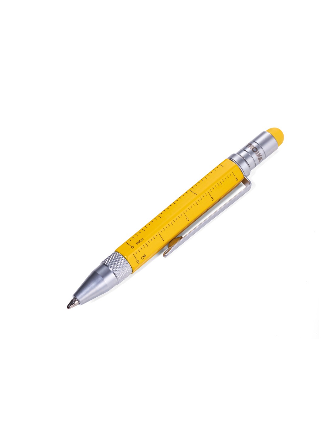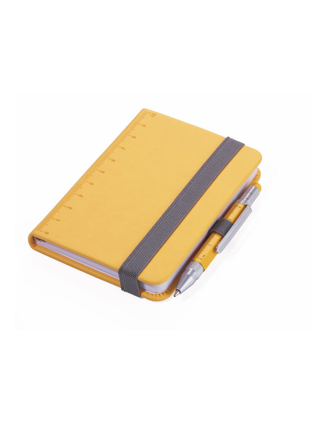 Bloc-notes DIN A7 incl. stylo à bille, fermeture à bande élastique, boucle de stylo, signet, règle en relief (10 cm) sur couverture, papier certifié FSC, côtés perforés, matrice de points, compartiment pour les documents, stylo à bille multitâche CONSTRUCTION LILIPUT (petit), mine noire, métal, similicuir, mat, jaune