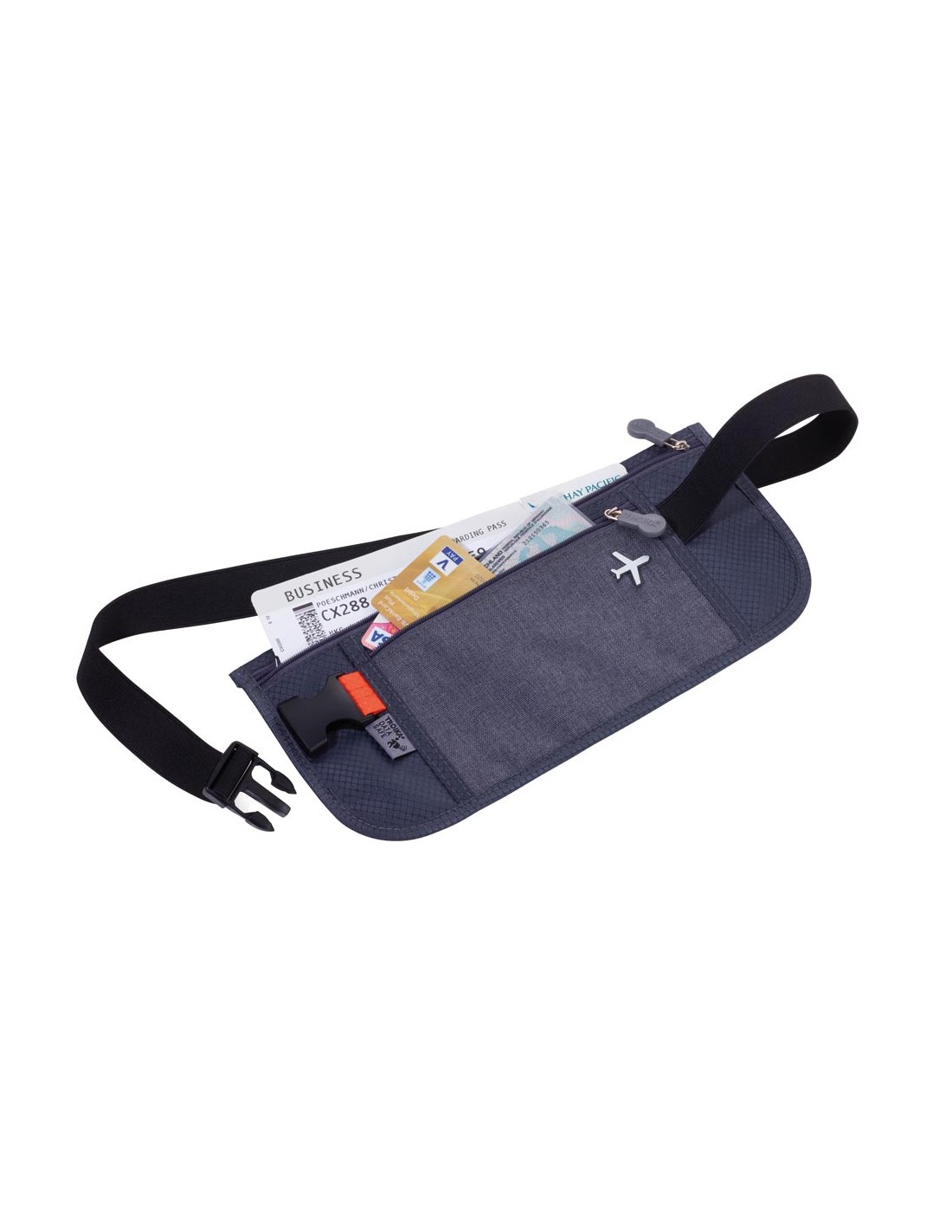 Sac banane avec 2 poches à fermeture à glissière, 1 compartiment avec protection de lecture (pour les puces RFID), idéal pour tickets, passeport, carte d'identité, permis de conduire, carte d'embarquement, polyester, gris