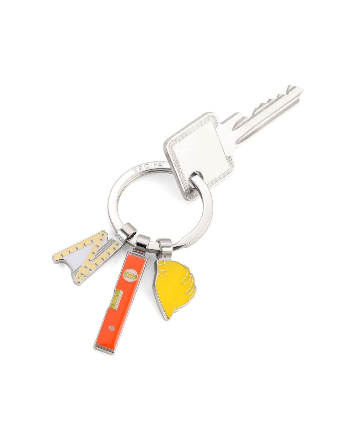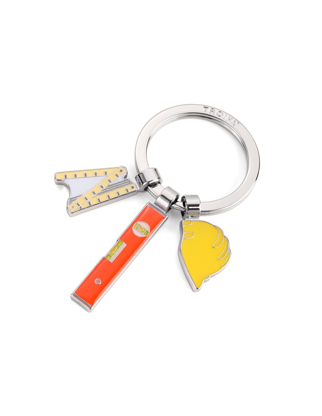Porte-clés avec 3 breloques, mètre pliant, niveau à bulle et casque de chantier, émail, fonte métallique, chrome, brillant, argenté/jaune/orange