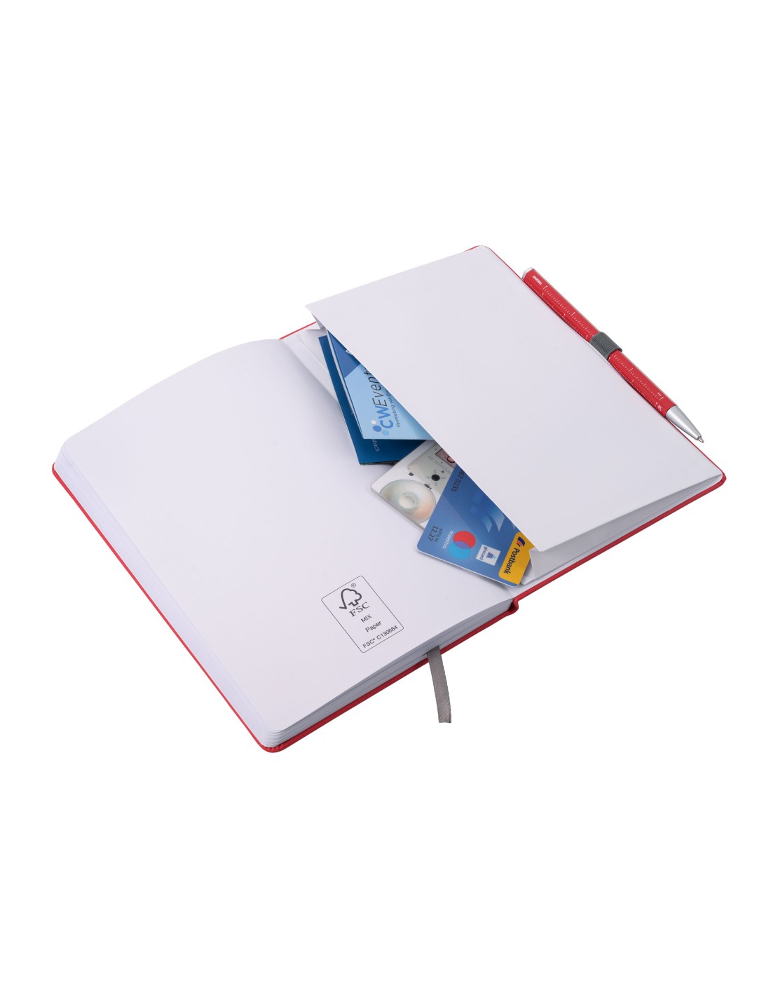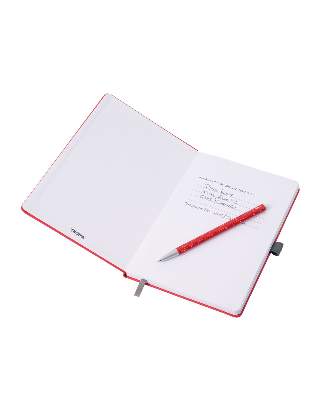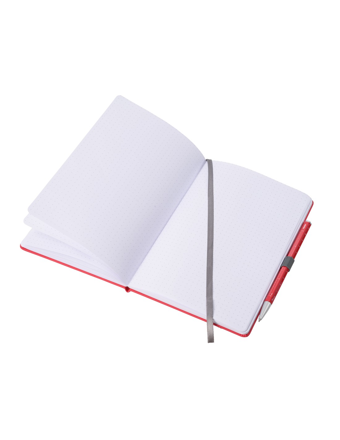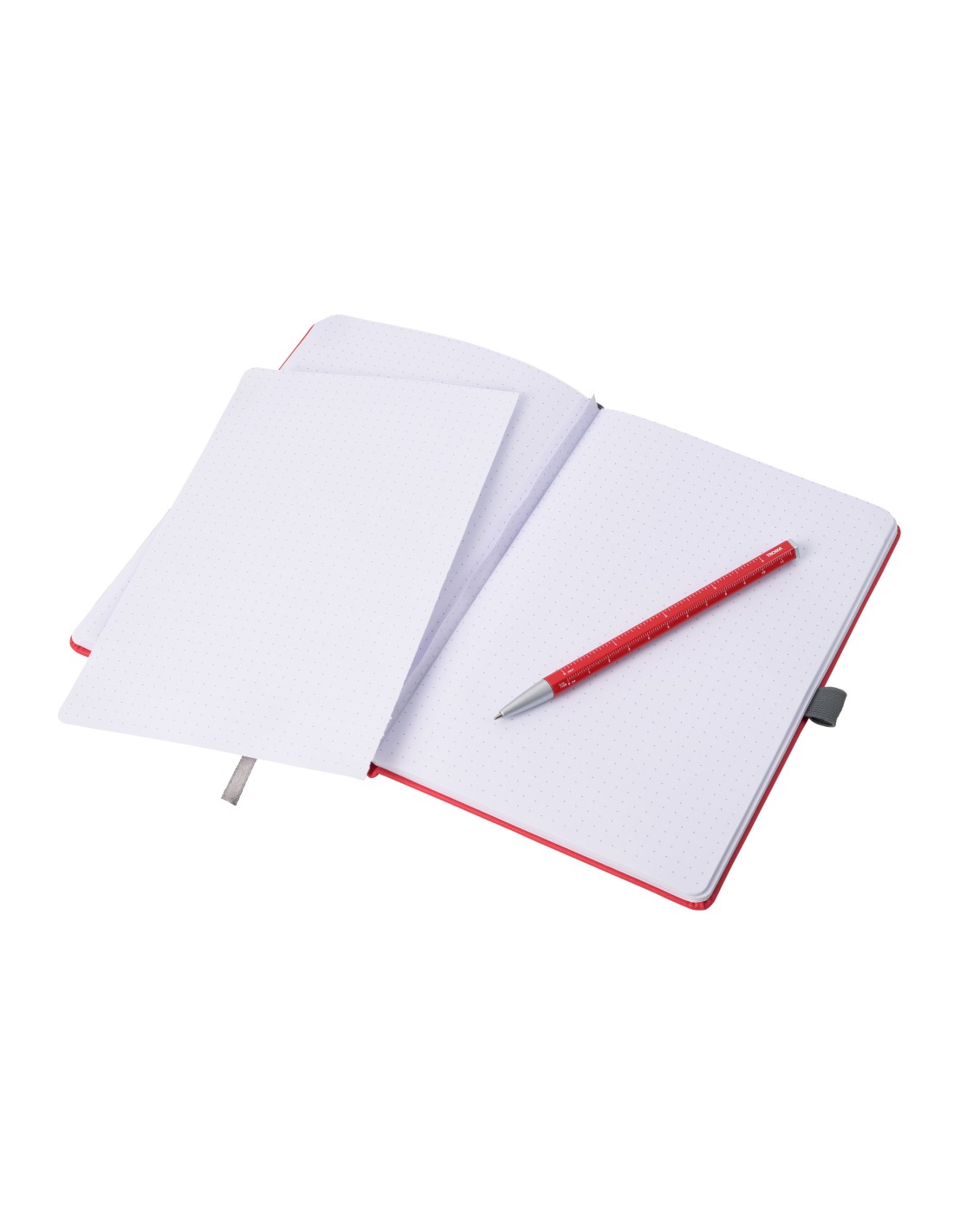 Bloc-notes DIN A5 incl. stylo à bille, fermeture à bande élastique, boucle de stylo, signet, règle en relief (20 cm) sur couverture, papier certifié FSC, 80gr., 64 pages perforés (128 côtés), matrice de points, compartiment pour les documents, stylo à bille multitâche CONSTRUCTION BASIC (mine noire D1), similicuir, métal, mat, rouge