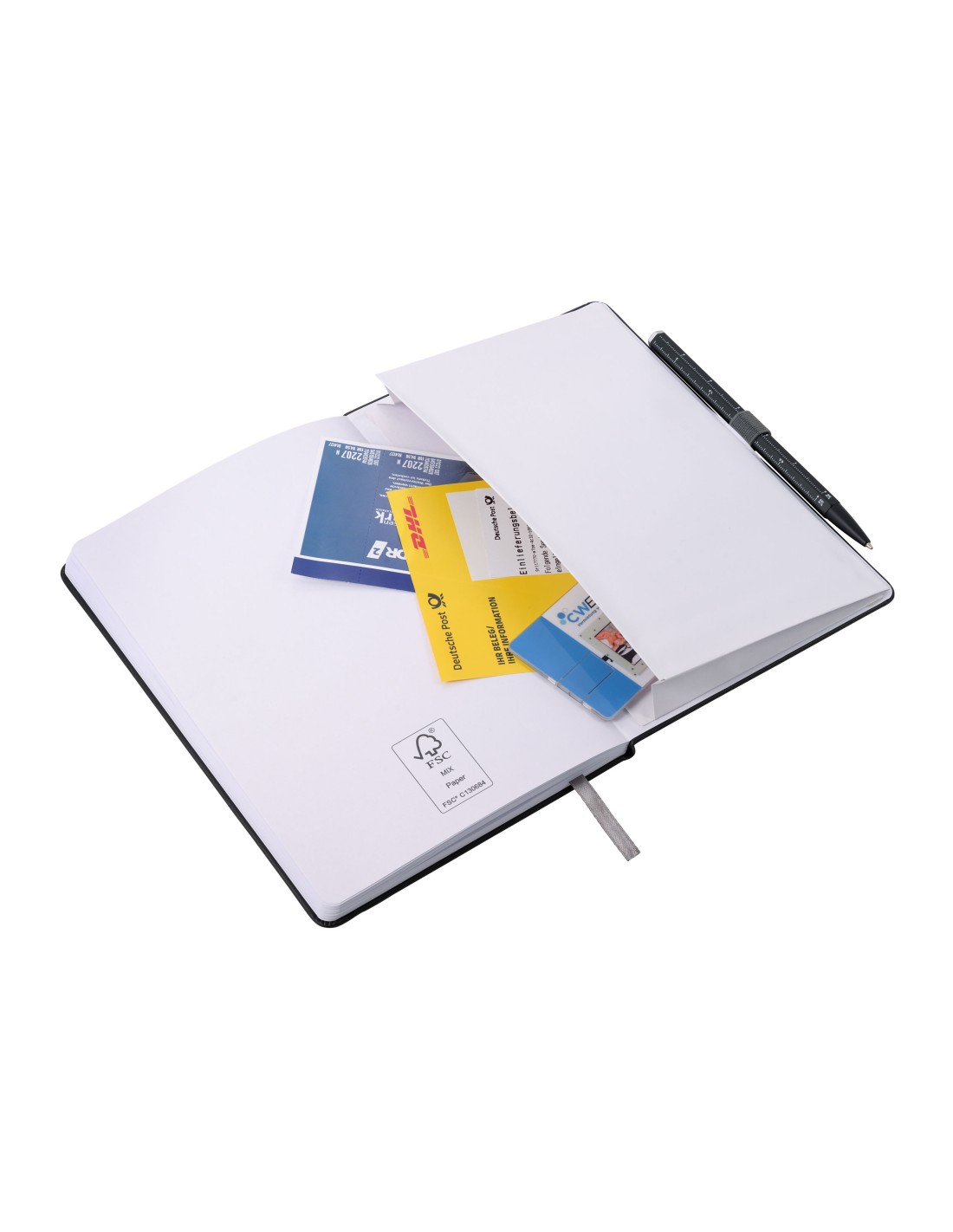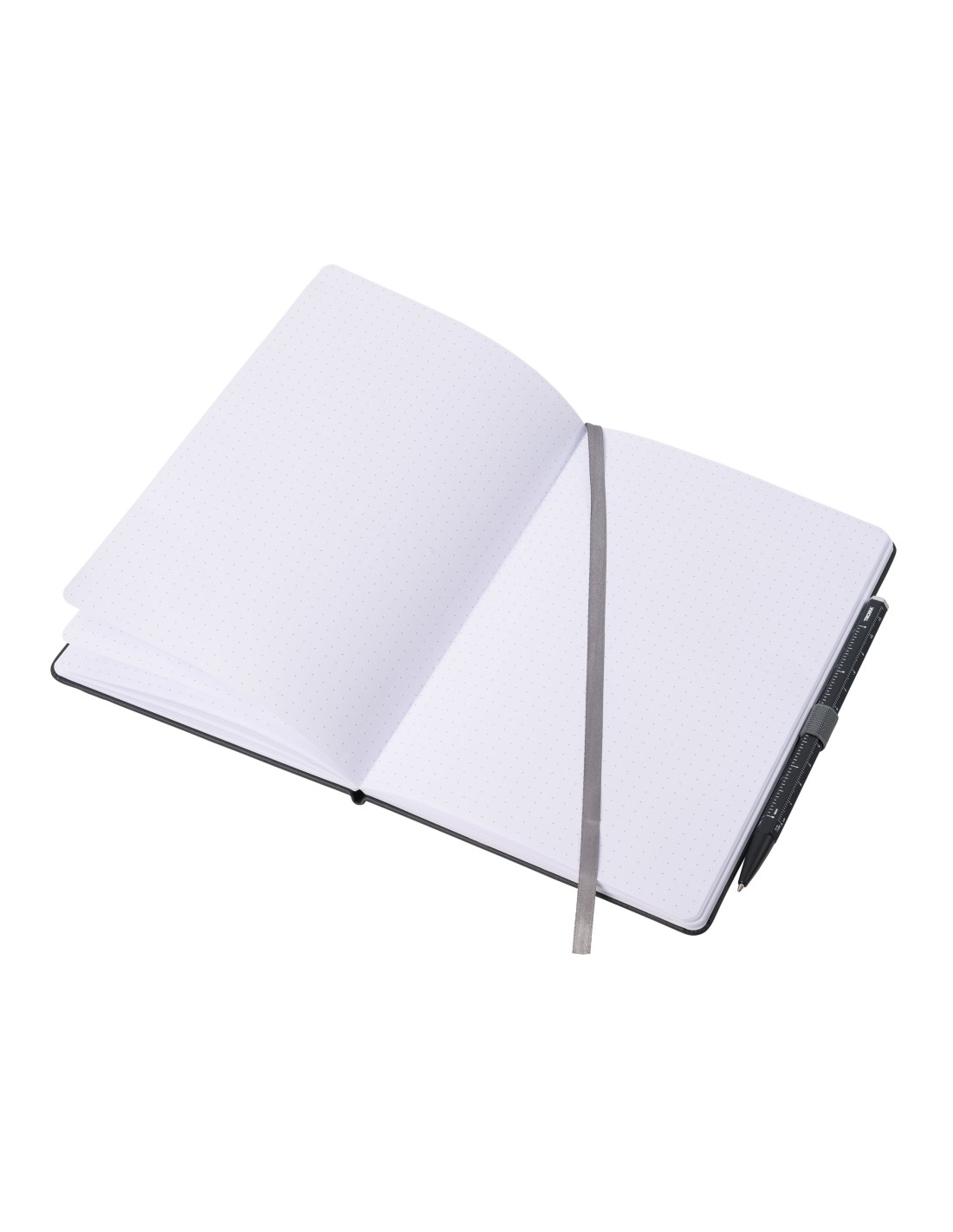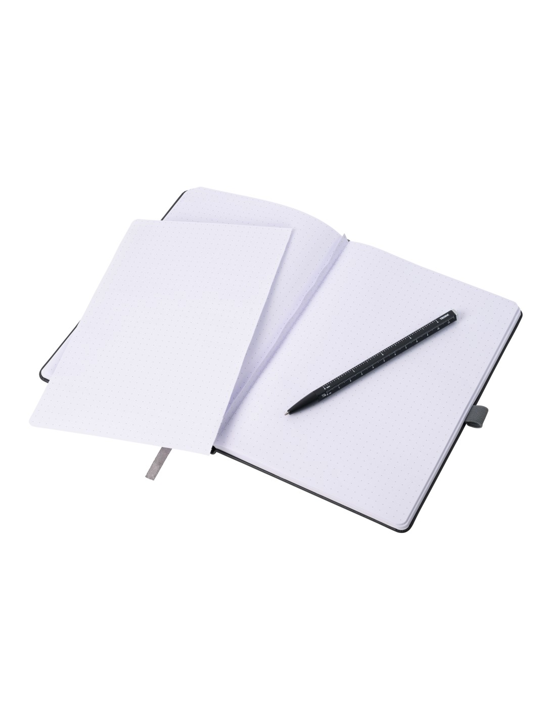 Bloc-notes DIN A5 incl. stylo à bille, fermeture à bande élastique, boucle de stylo, signet, règle en relief (20 cm) sur couverture, papier certifié FSC, 64 pages perforés (128 côtés), matrice de points, compartiment pour les documents, stylo à bille multitâche CONSTRUCTION BASIC (mine noire D1), similicuir, métal, mat, noire