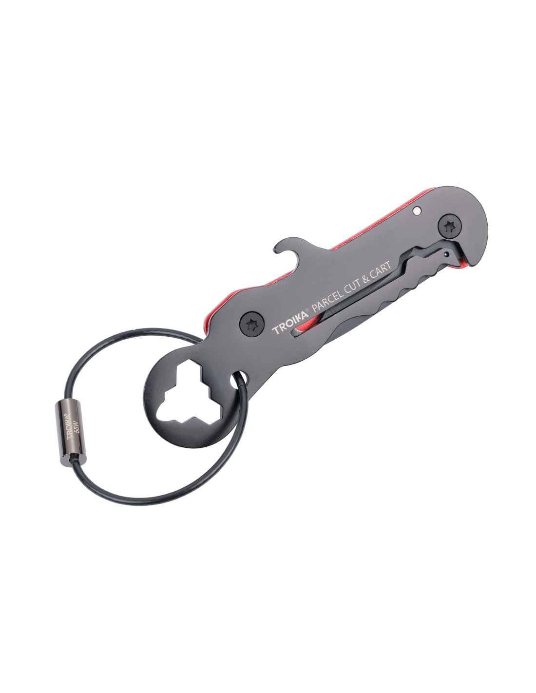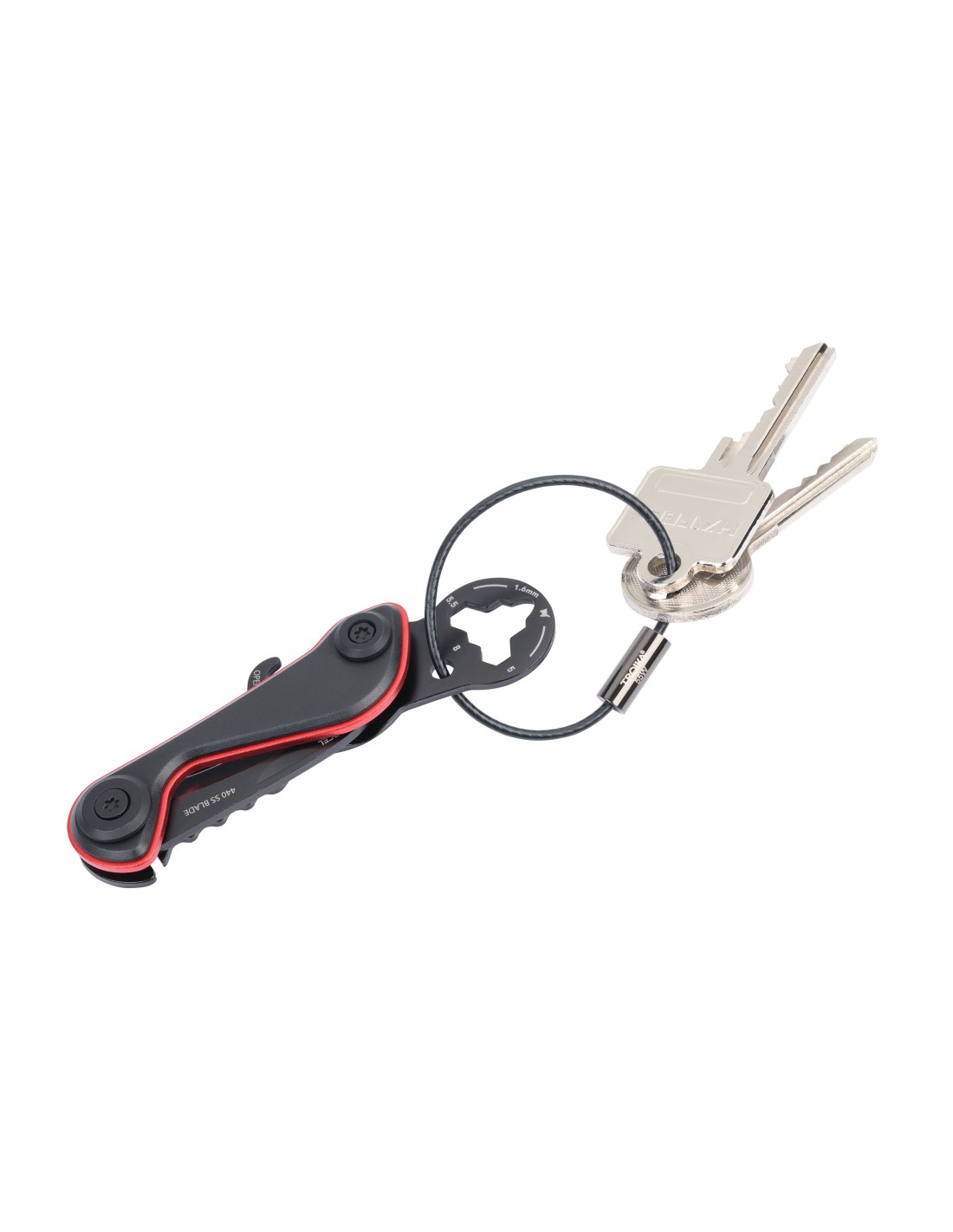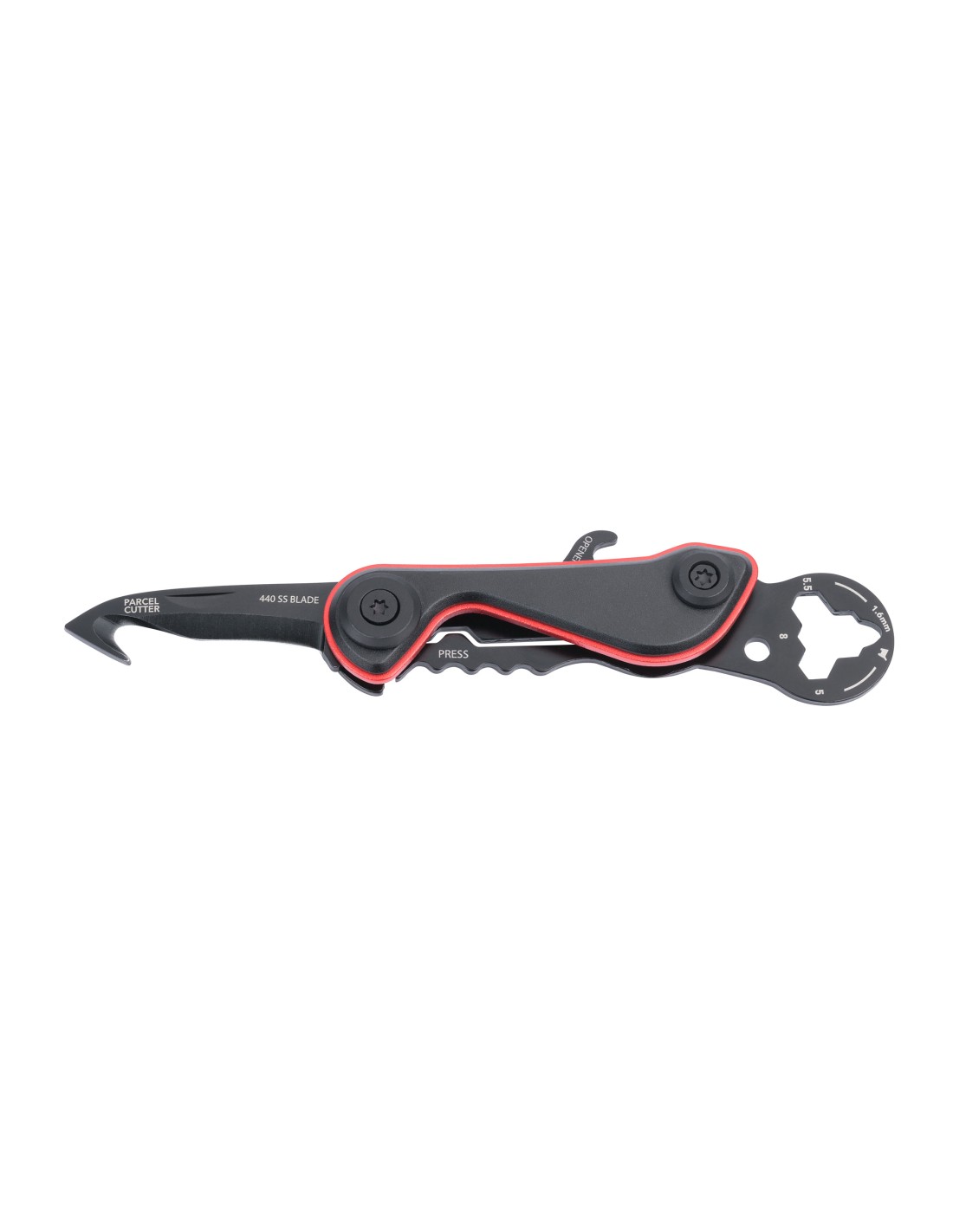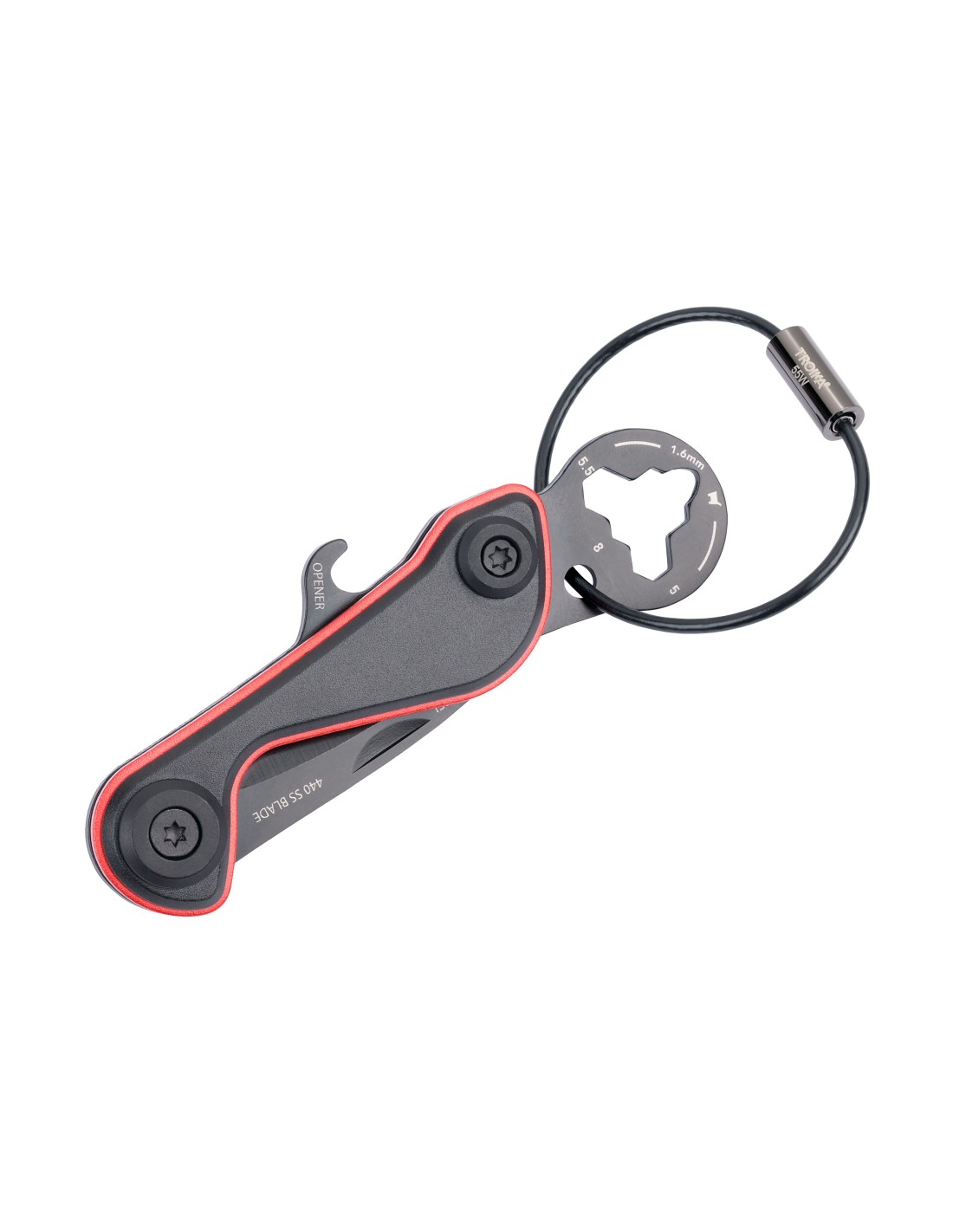 Mini-outil avec 9 fonctions, jeton de chariot, couteau à paquets + lame en acier inoxydable 440 avec fonction d'encliquetage, porte-clés (boucle de fil), décapsuleur, clé hexagonale (3 tailles), jauge profondeur pneu (1,6 mm), acier inoxydable 440, aluminium, anodisénoire/rouge
