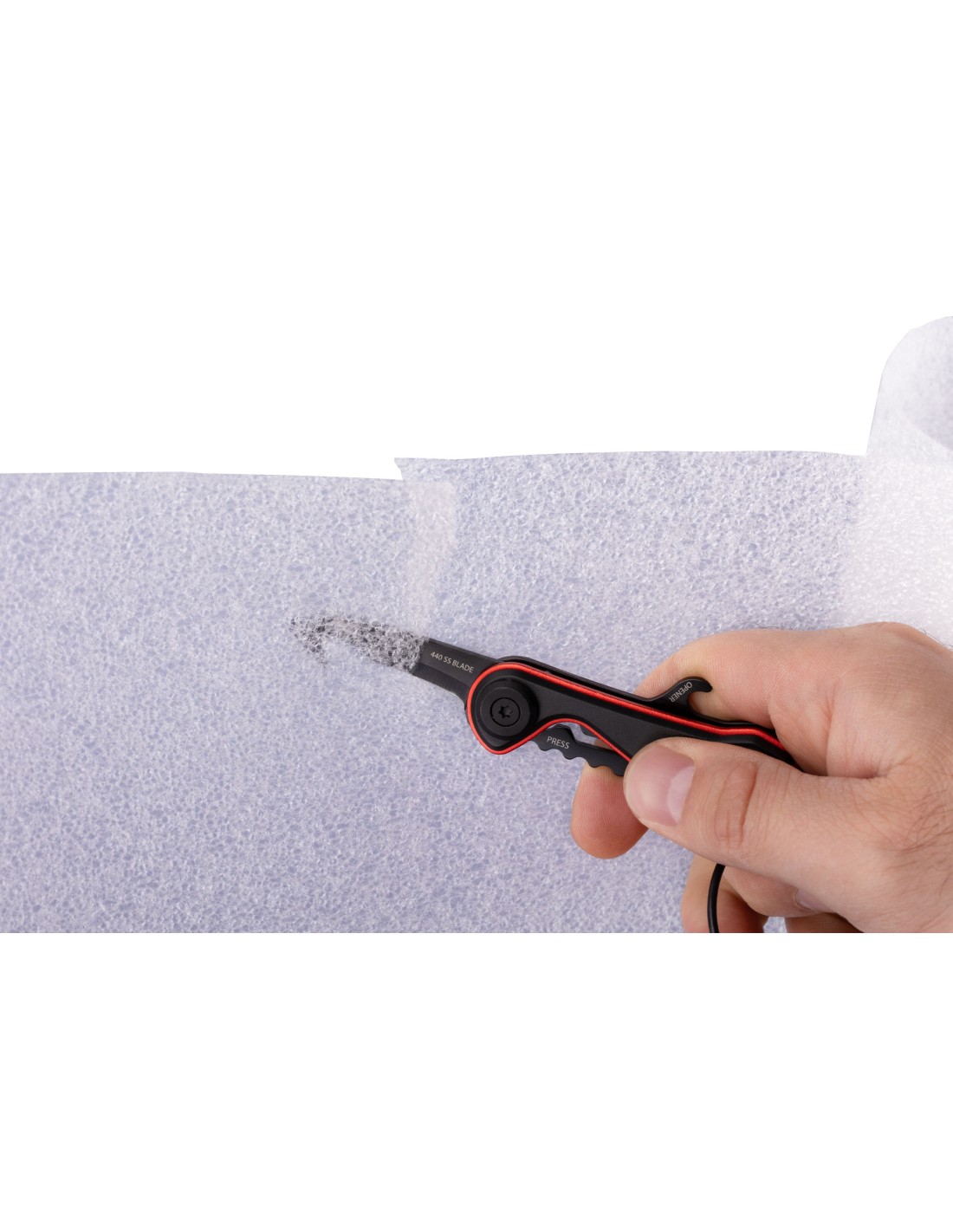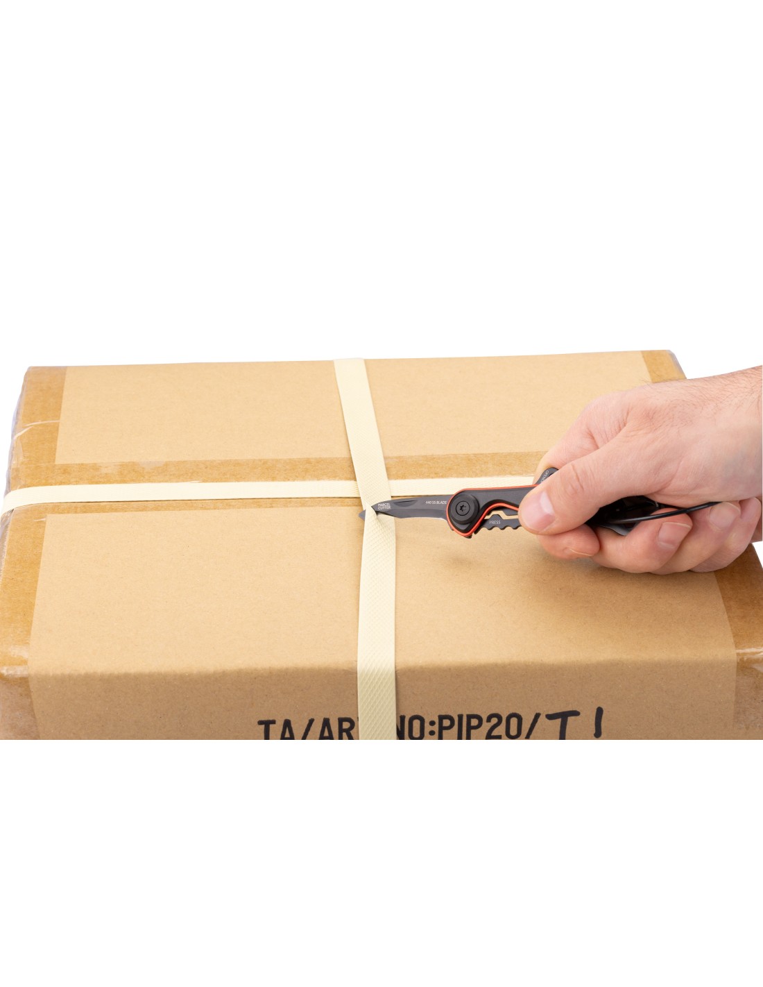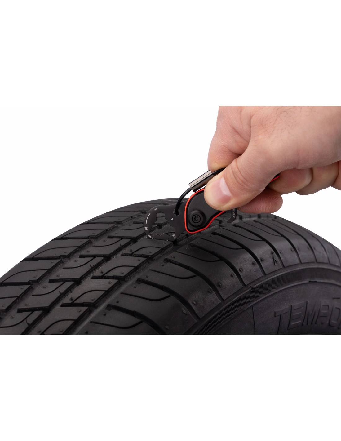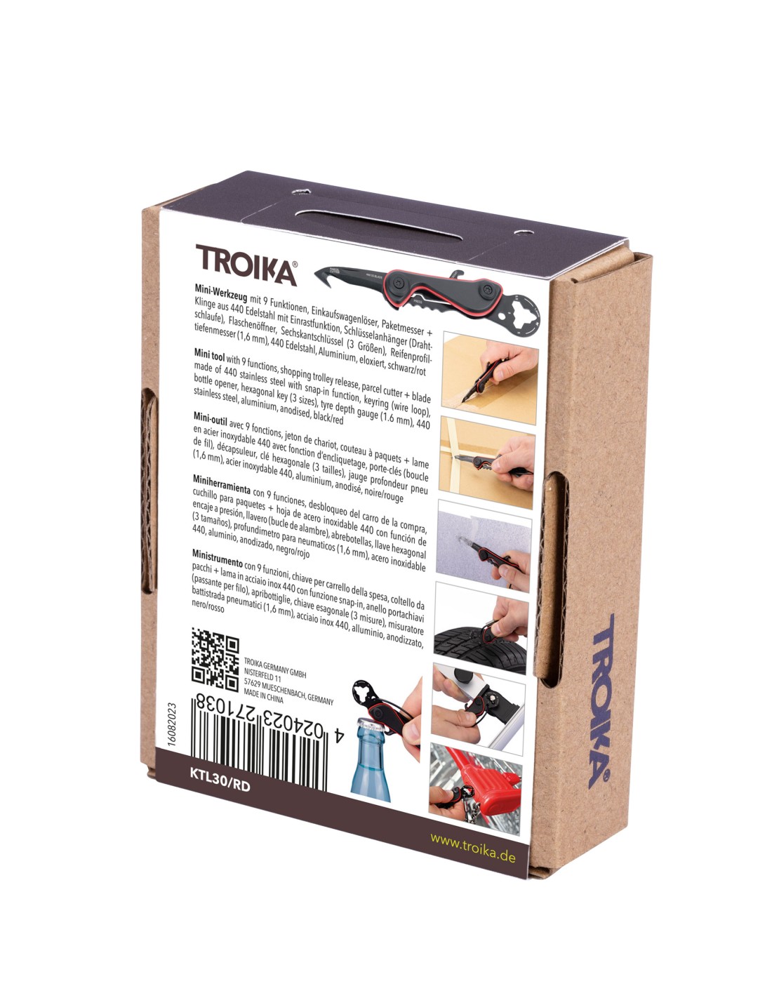 Mini-outil avec 9 fonctions, jeton de chariot, couteau à paquets + lame en acier inoxydable 440 avec fonction d'encliquetage, porte-clés (boucle de fil), décapsuleur, clé hexagonale (3 tailles), jauge profondeur pneu (1,6 mm), acier inoxydable 440, aluminium, anodisénoire/rouge