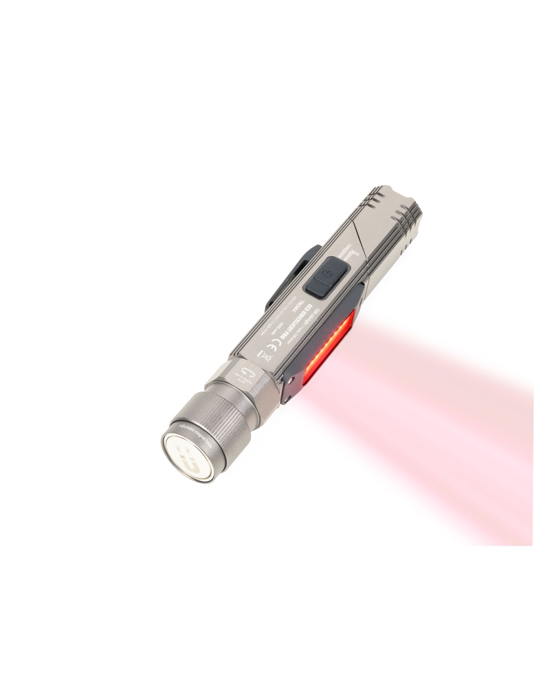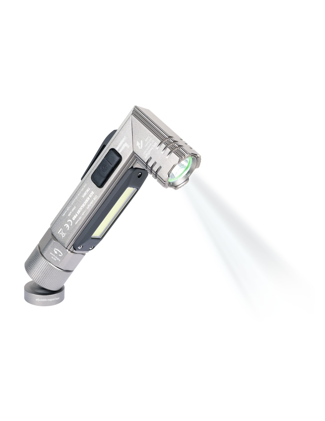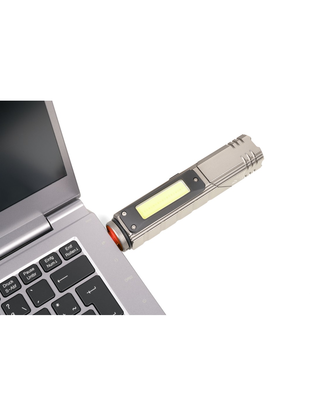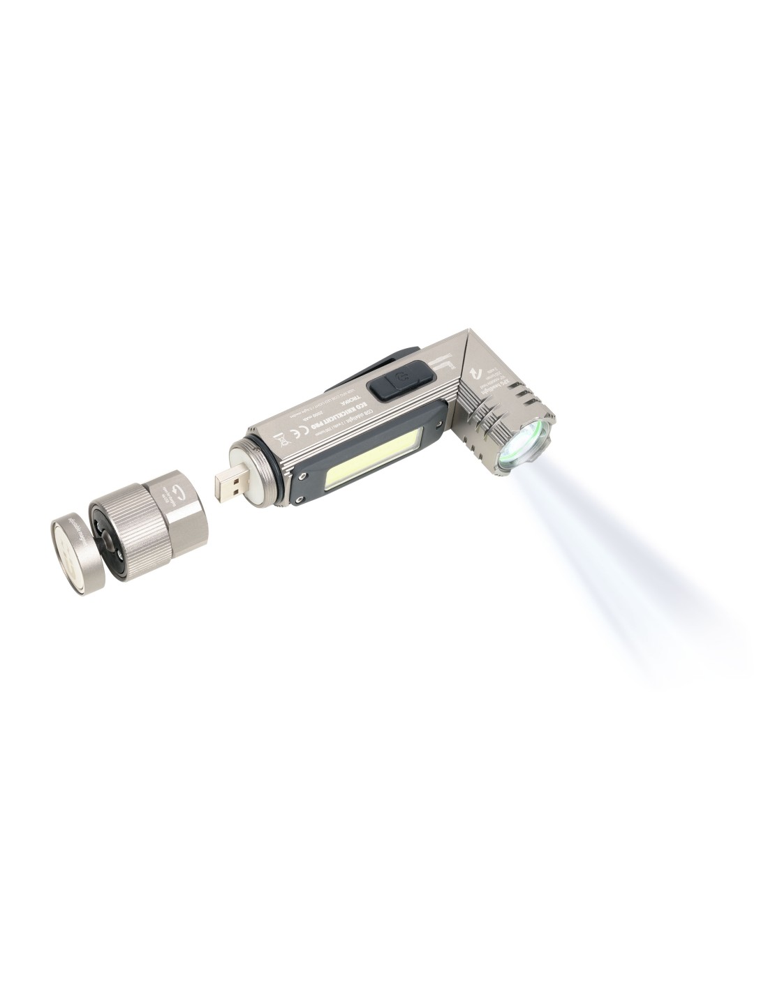 Lampe de poche / repliable, multifonctionnelle : lampe de travail e de sécurité, 5 fonctions d'éclairage, lampe avant : 100 % de lumière + 50 % de lumière (LED blanche, 200 lumens), LED COB latérale (150 lumens) : lampe de travail, lumière rouge, lumière rouge clignotant rapidement, tête d'éclairage inclinable jusqu'à 90° pour un éclairage optimal, fonction magnétique : visser au pied de support et fixer aux surfaces métalliques de manière rotative, clip de ceinture, batterie lithium-ion 2.000 mAh, écologique, car rechargeable via une prise USB intégrée, anti-éclaboussures (IPX4 imperméable), plastique ABS, aluminium, mat, couleur titane