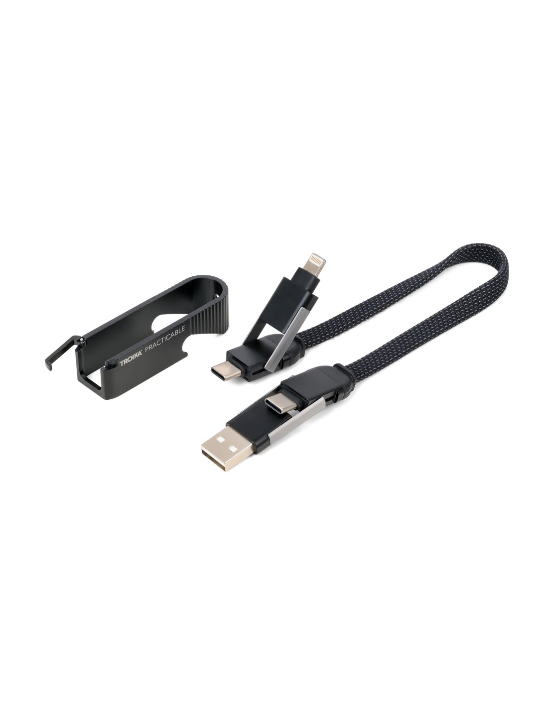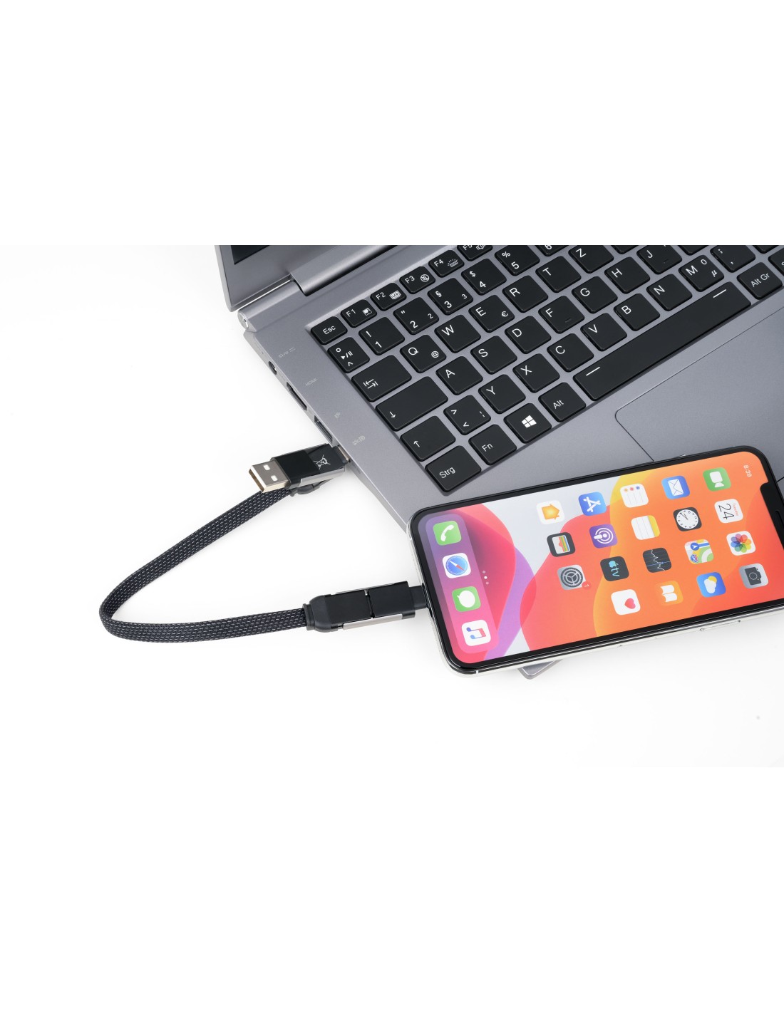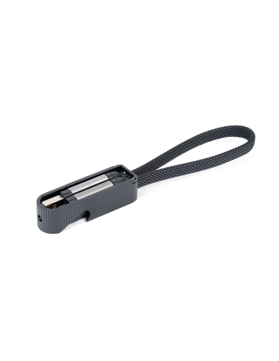 Câble de recharge rapide avec décapsuleur pour les déplacements, USB/USB-C vers Lightning ou USB-C, avec fonction de transfert de données, câble avec revêtement textile, métal, mat, noir