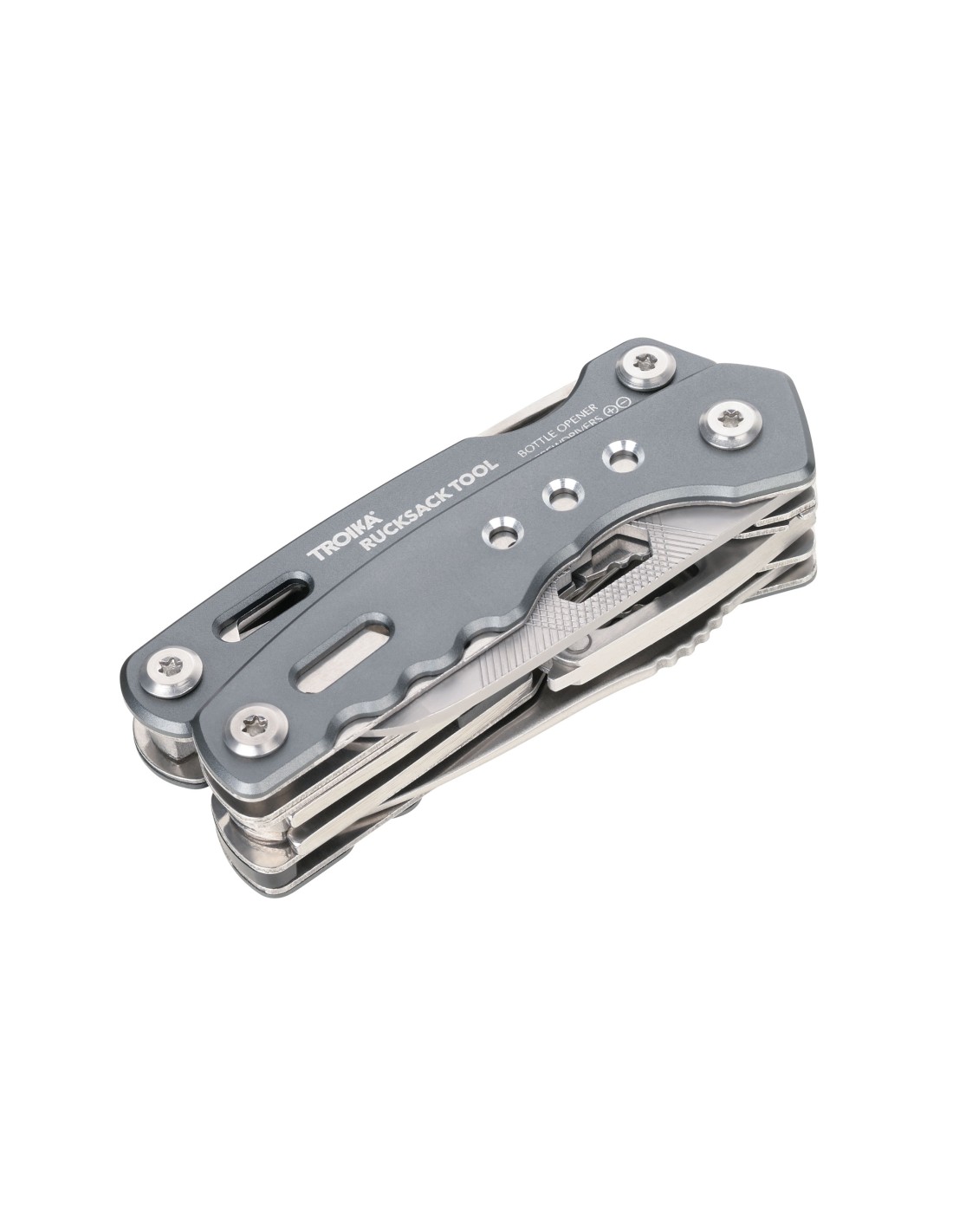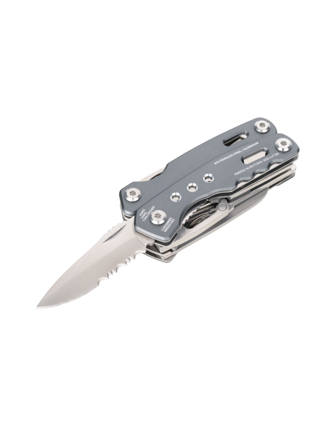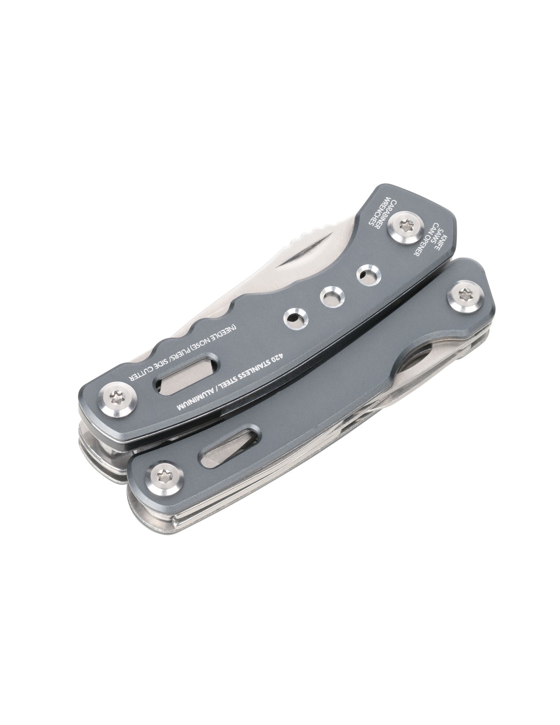 Outil avec multifonctions pour sac à dos avec 15 fonctions, ressort intégré et fonction de blocage, pince pointue, pince, pince coupante diagonale, couteau, scie, tournevis plat, ouvre-boîte, lime, mousqueton, décapsuleur, clé hexagonale, outils à l'extérieur en position repliée, dans une pochette en nylon avec passant de ceinture, acier inoxydable 420, aluminium, anodisé, mat, gris