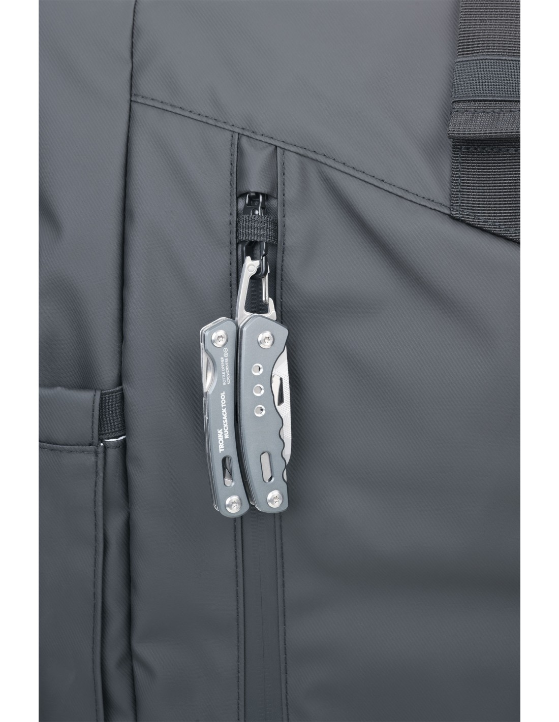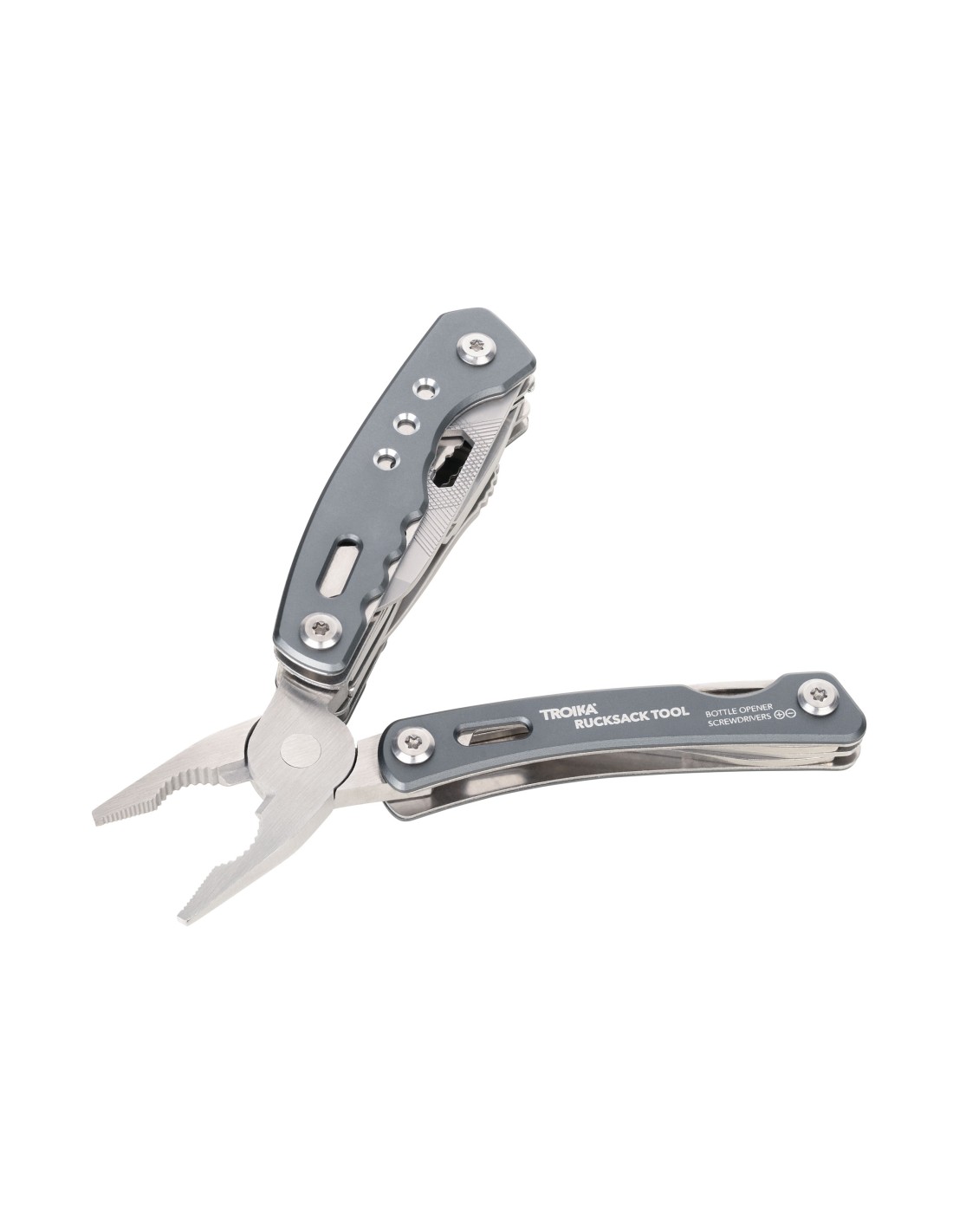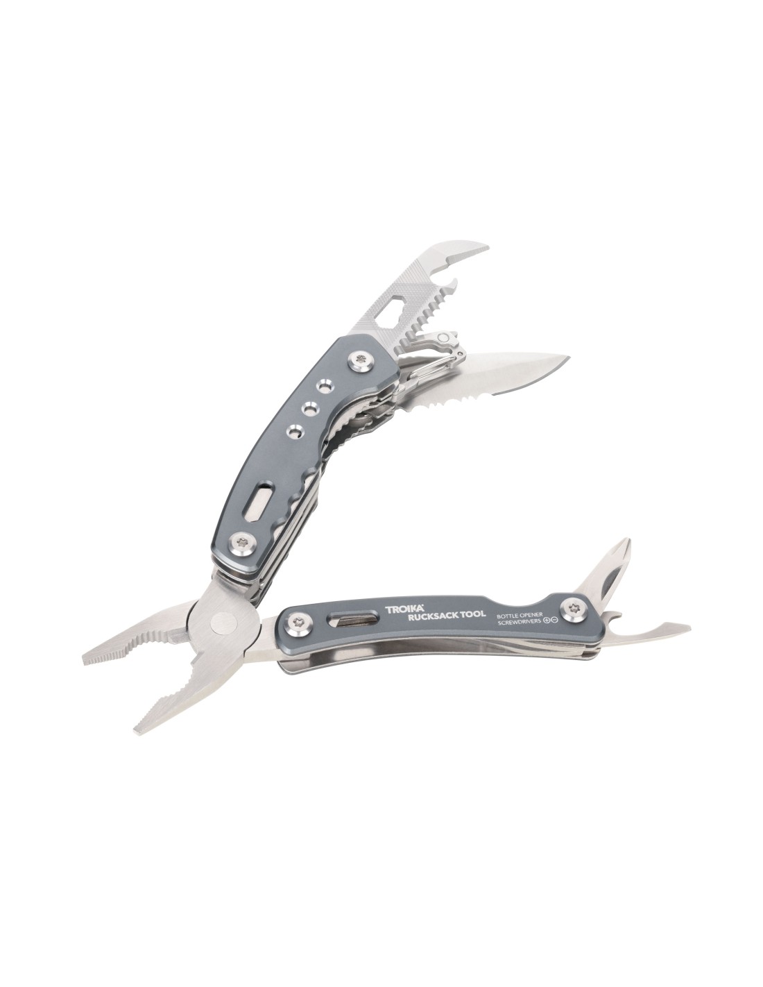 Outil avec multifonctions pour sac à dos avec 15 fonctions, ressort intégré et fonction de blocage, pince pointue, pince, pince coupante diagonale, couteau, scie, tournevis plat, ouvre-boîte, lime, mousqueton, décapsuleur, clé hexagonale, outils à l'extérieur en position repliée, dans une pochette en nylon avec passant de ceinture, acier inoxydable 420, aluminium, anodisé, mat, gris