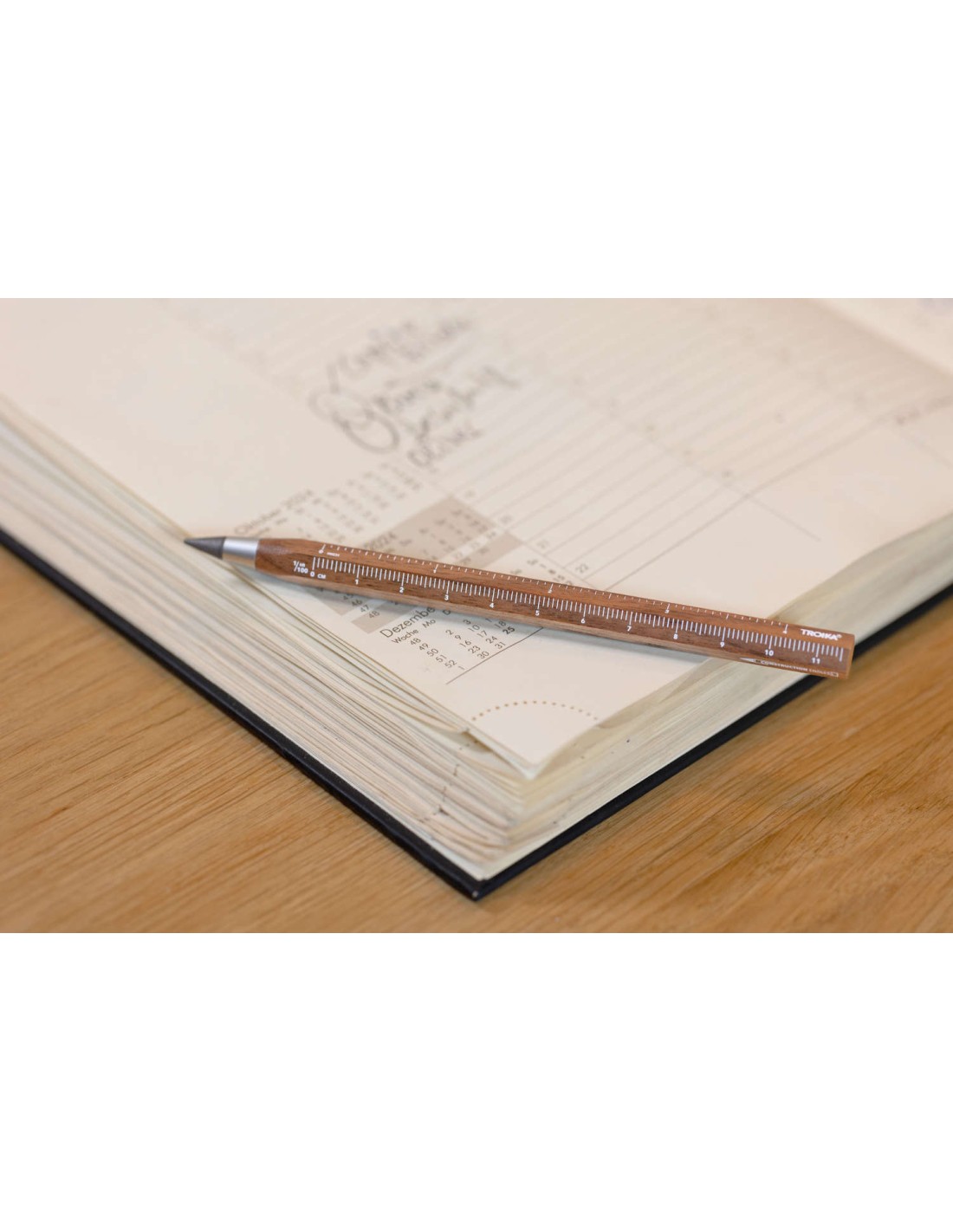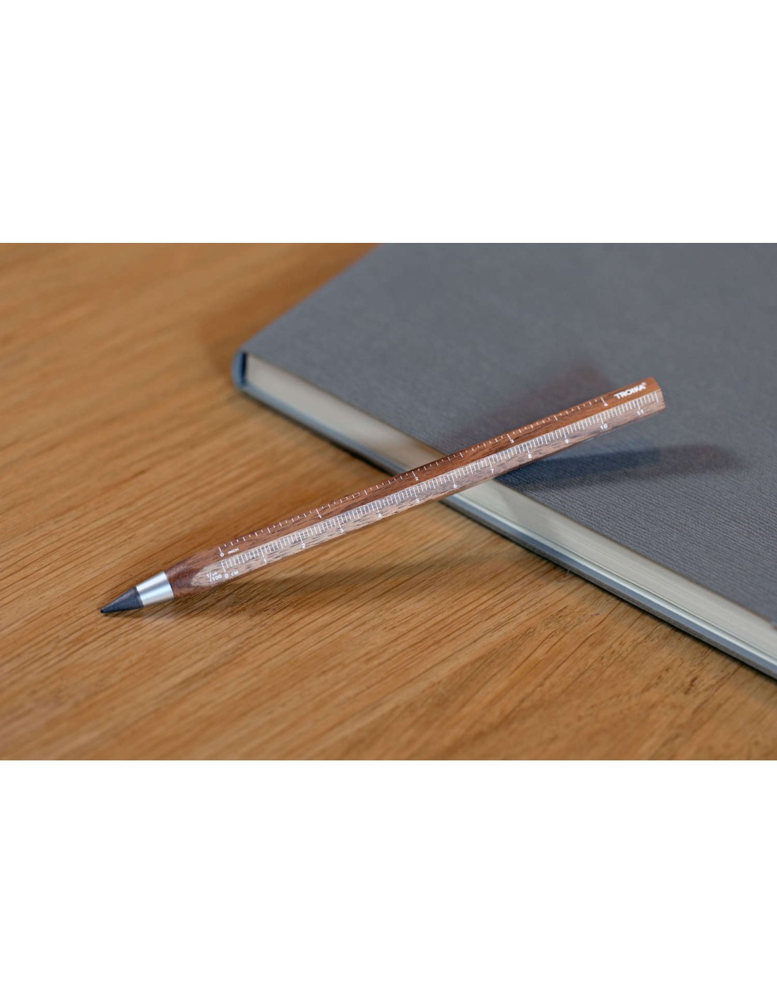 Crayon multitâche avec pointe d'écriture durable sans fin (env. 20 km de longueur d'écriture), en bois de noyer certifié FSC, HB, effaçable, sans tailleur, règle en centimètres/pouces, échelle 1:20/1:50, pointe d'écriture interchangeable, bois, métal, marron