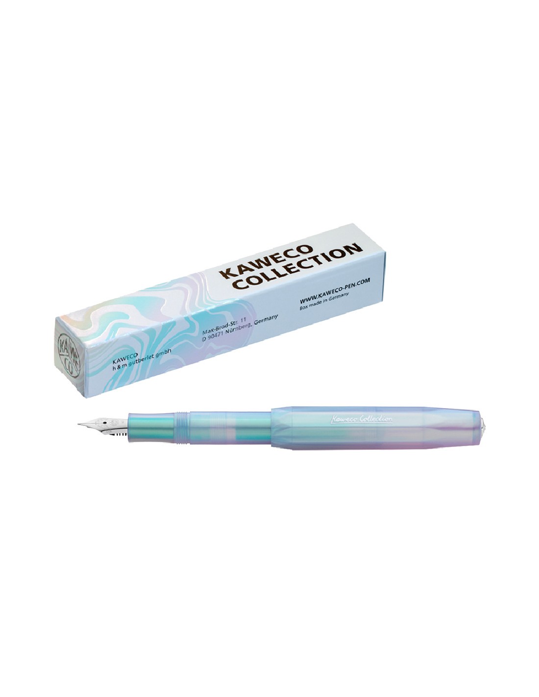 Aspect nacré irisé. Le Kaweco Iridescent Pearl - un stylo plume aux couleurs insoupçonnées : Selon l'angle de vue de l'observateur et la lumière incidente, l'instrument d'écriture brille d'une couleur changeante unique. Imitant l'effet optique de la nacre, le matériau translucide du stylo plume scintille dans des couleurs allant du vert-bleuâtre au rose. L'emballage du stylo est assorti d'un film irisé. L'optique imite les stries qui apparaissent dans le plastique grâce aux pigments et qui contribuent à l'aspect unique du stylo.