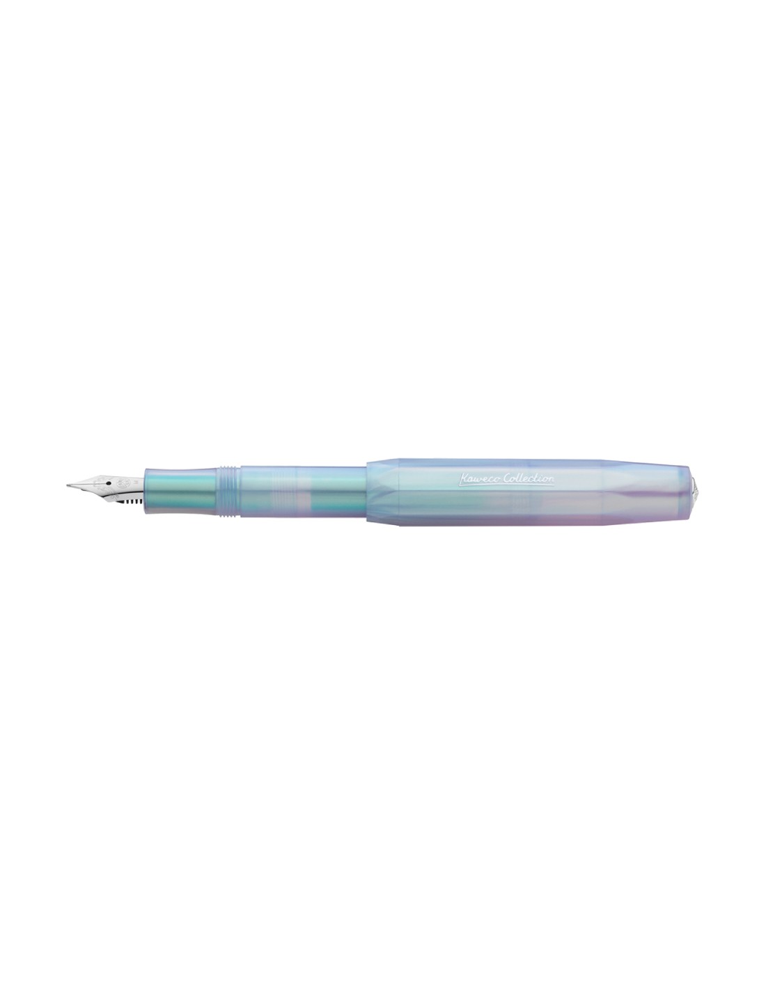 Aspect nacré irisé. Le Kaweco Iridescent Pearl - un stylo plume aux couleurs insoupçonnées : Selon l'angle de vue de l'observateur et la lumière incidente, l'instrument d'écriture brille d'une couleur changeante unique. Imitant l'effet optique de la nacre, le matériau translucide du stylo plume scintille dans des couleurs allant du vert-bleuâtre au rose. L'emballage du stylo est assorti d'un film irisé. L'optique imite les stries qui apparaissent dans le plastique grâce aux pigments et qui contribuent à l'aspect unique du stylo.