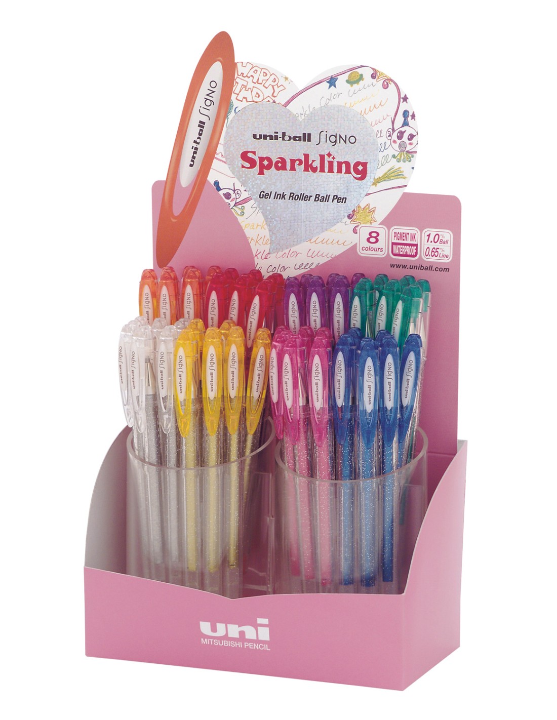 Un display compact et attractif, de 96 pièces, qui réunit les 8 couleurs des stylos gel uniball UM120SP Sparkling. Idéal pour un deuxième POS, ou pour des achats spontanés à la caisse.