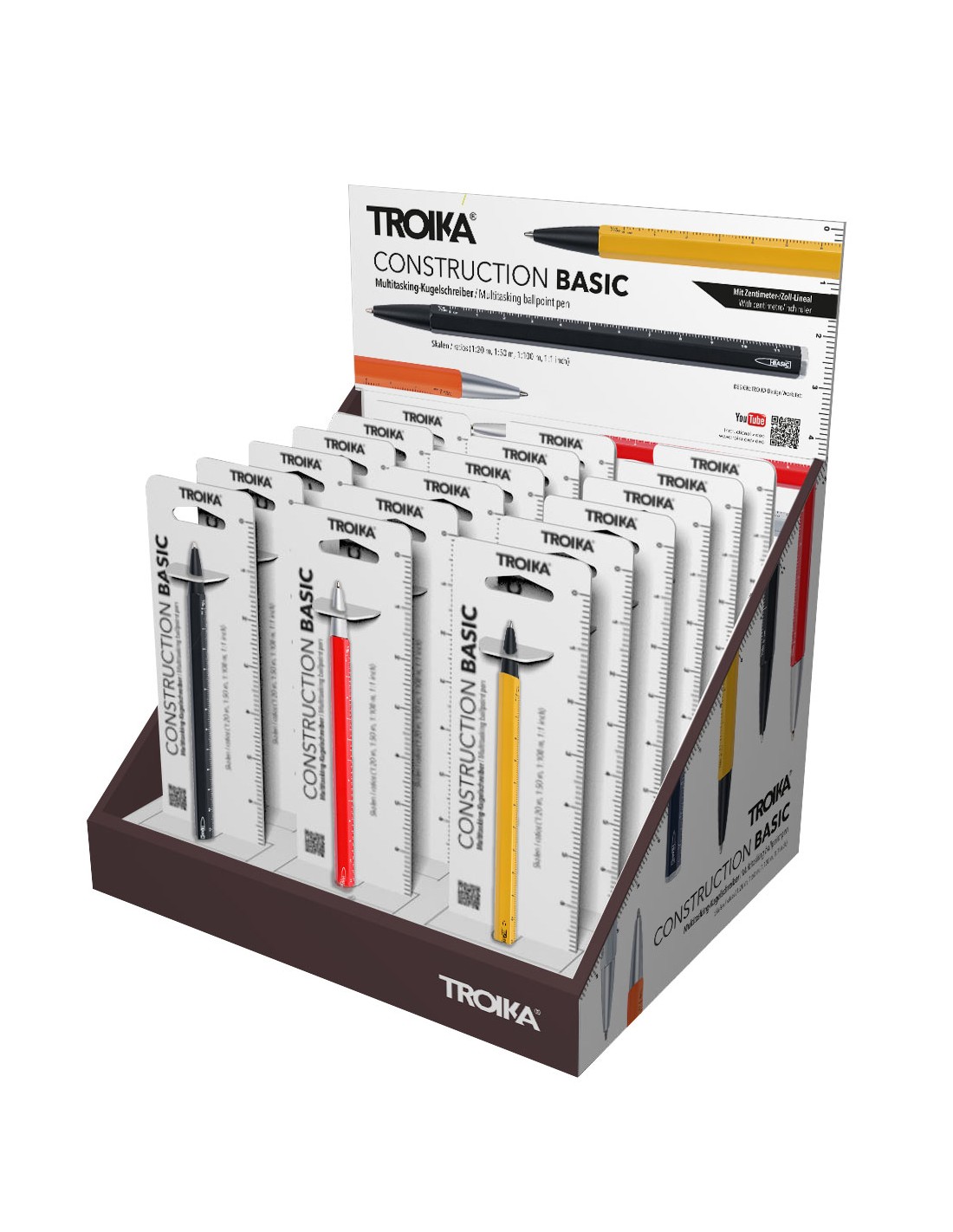 Présentoir de comptoir incl. 18 x CONSTRUCTION BASIC Stylo à bille multifonction, prétrié (chacun 3 x PES40/BK, PES40/DB, PES40/NO, PES40/RD, PES40/SI, PES40/YE), en libre-service, carton, imprimé, mat, multicolore