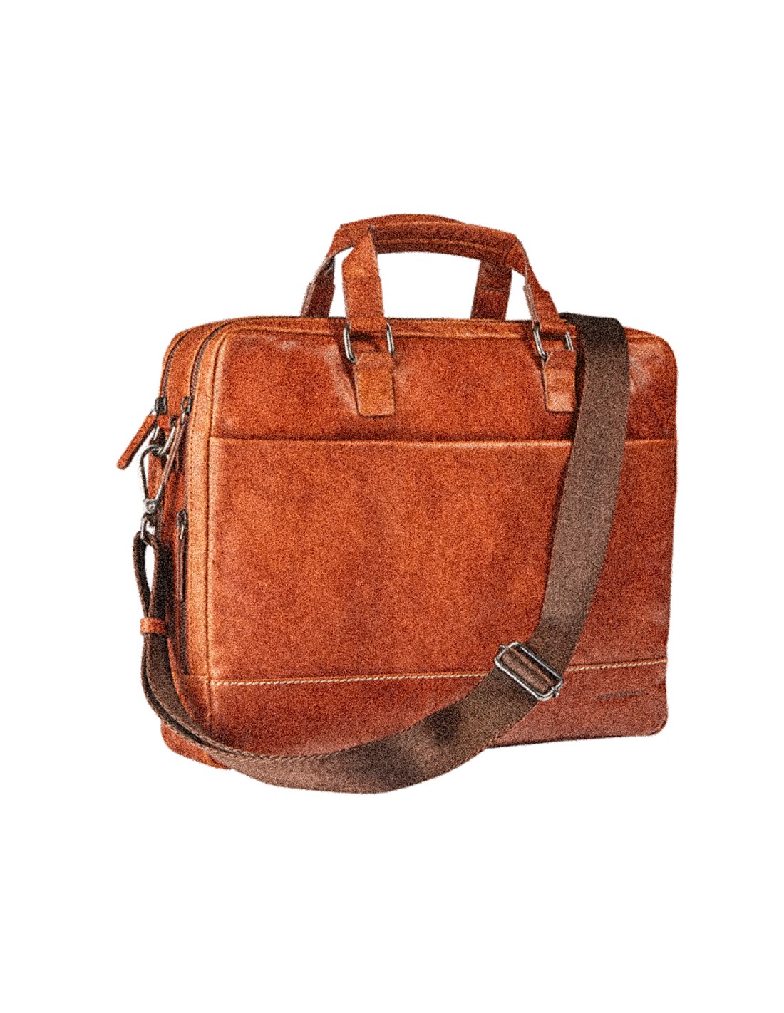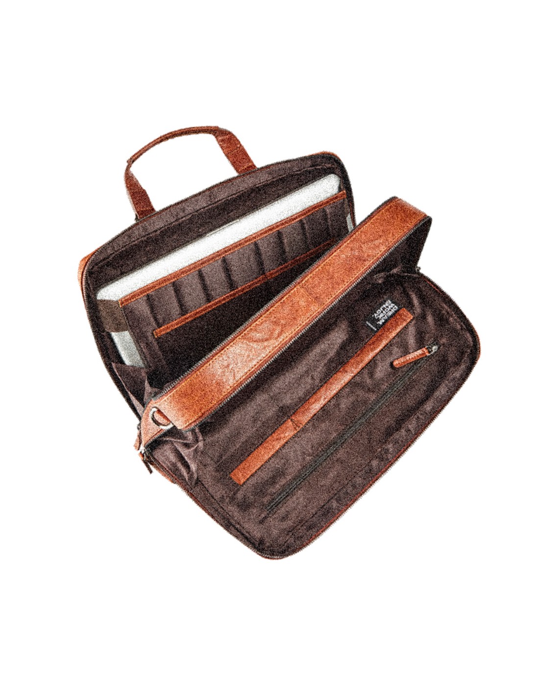 Sacoche élégante en cuir cognac pour ordinateur portable avec fermeture éclair et poches de rangement pratiques supplémentaires. Comprend 2 compartiments principaux, un compartiment renforcé pour ordinateur portable de 15'6'' et une poche extérieure pour garder des documents à portée de main.