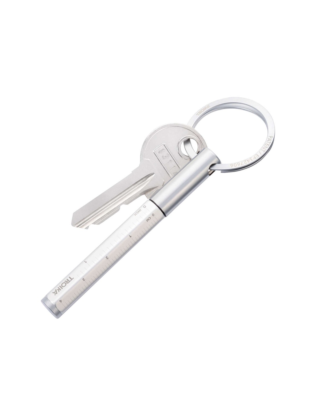 Crayon multitâche et porte-clés avec pointe d'écriture continue durable (env. 20km de longueur d'écriture), fixation rapide & facile des clés grâce au mécanisme d'ouverture breveté (TROIKA NAIL GUARD), règle en centimètres/pouces, HB, effaçable, sans taille, pointe d'écriture interchangeable, aluminium, mat, argenté