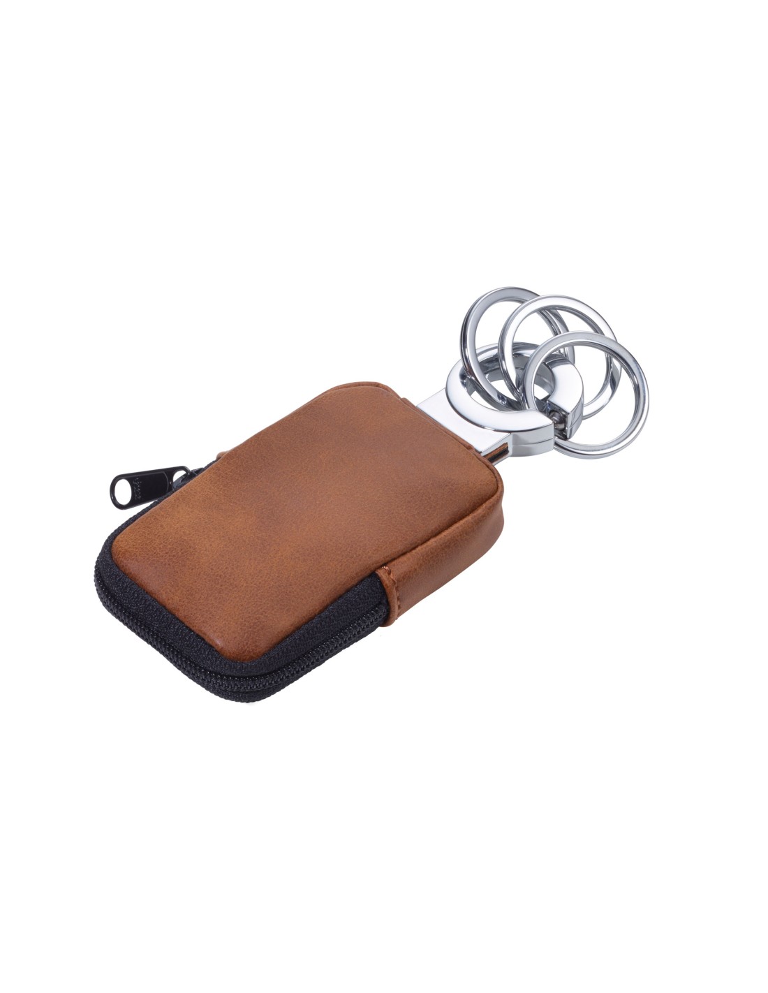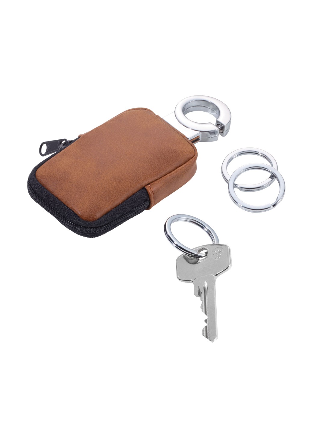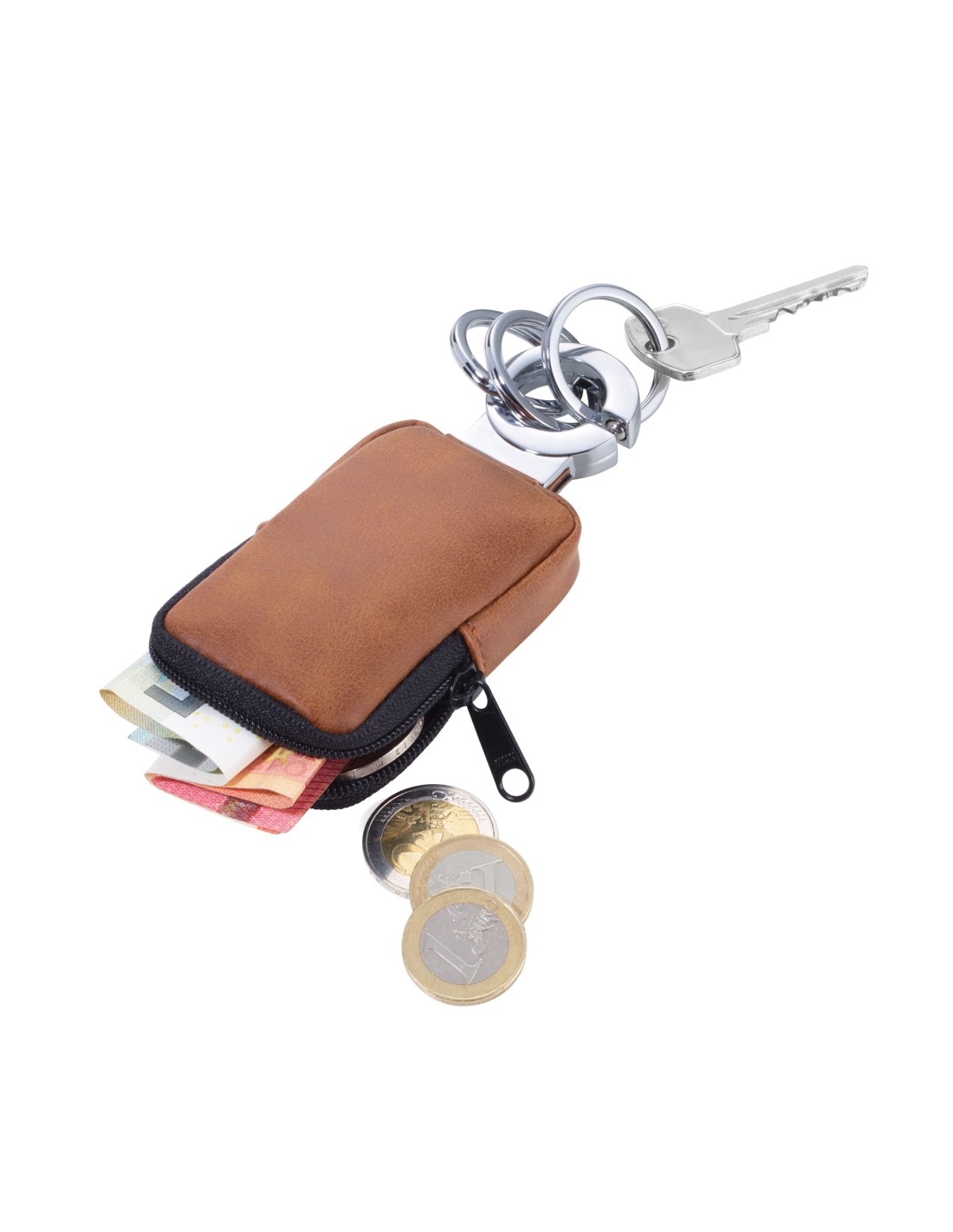 Porte-clés avec pochette pour pièces de monnaie, masque facial, etc., enduit antibactérien, tue 99,9% des bactéries de surface, fermeture zippée, 3 anneaux pour clès, fermoir "clic" pratique, métal, similicuir, brillant, marron