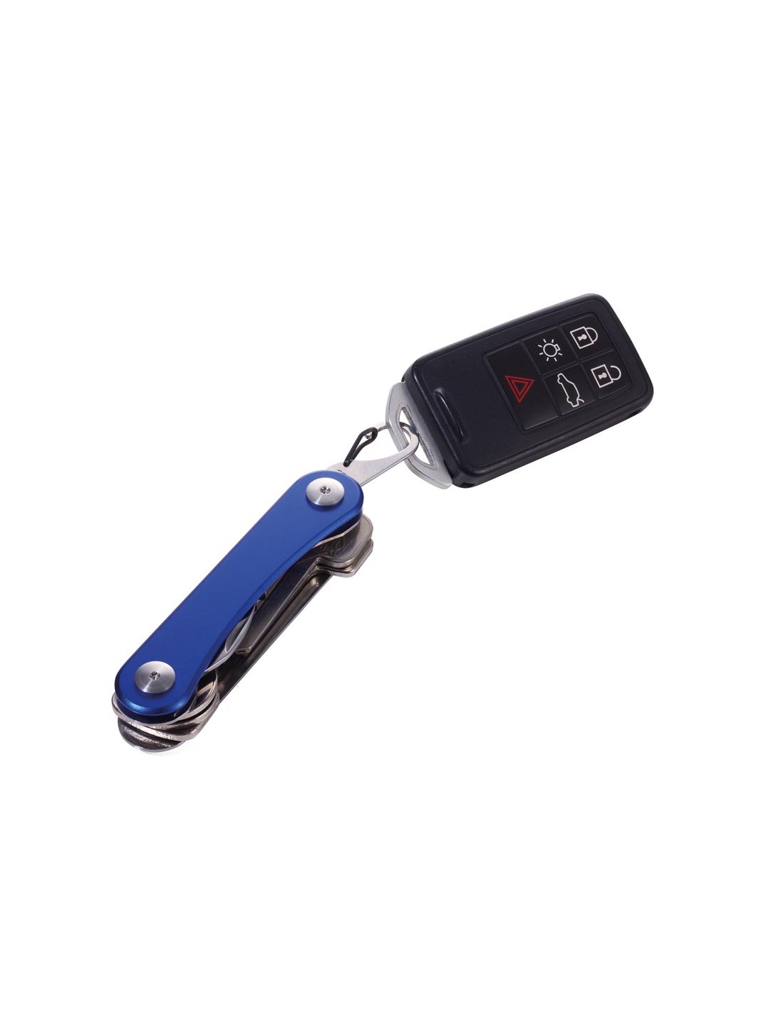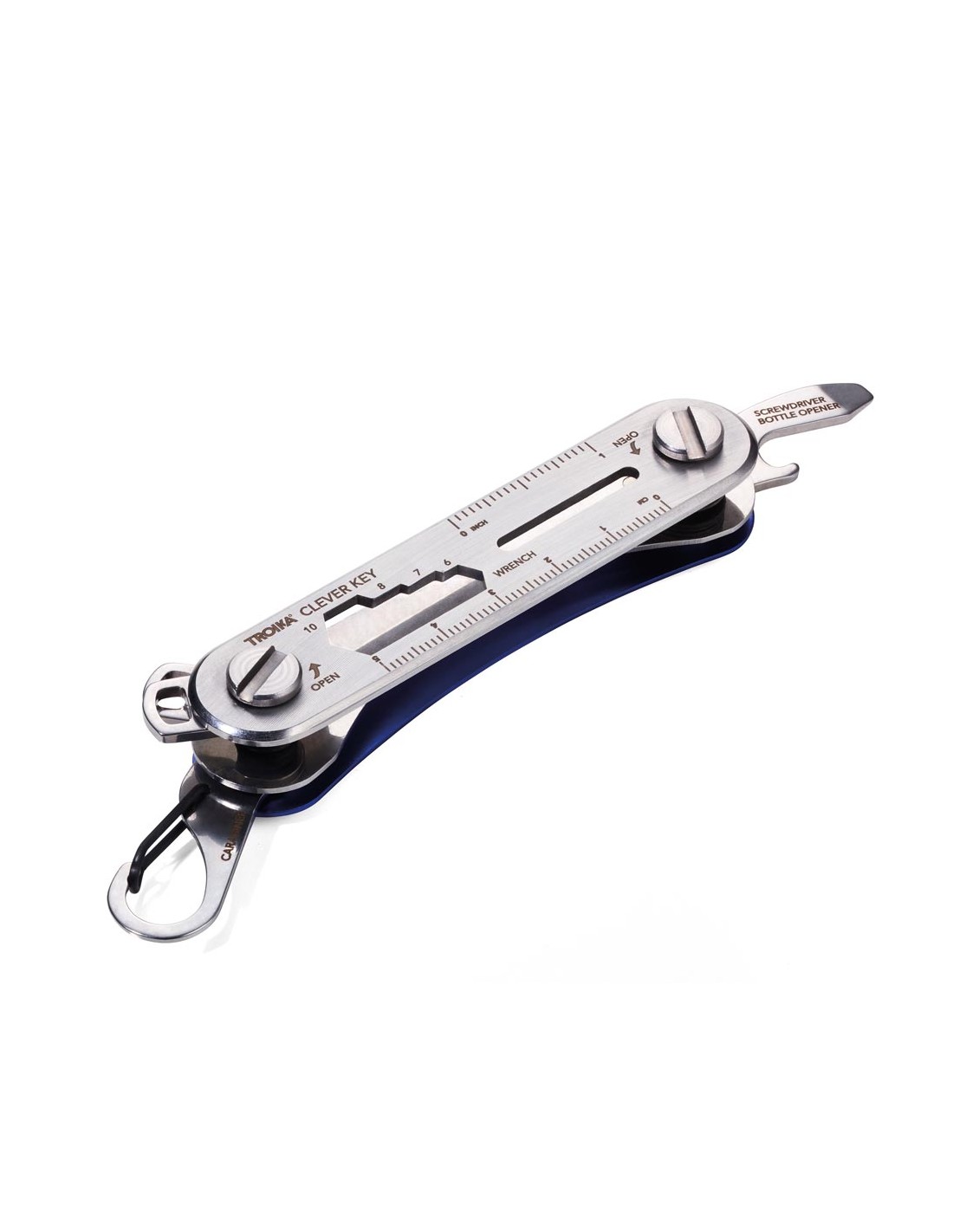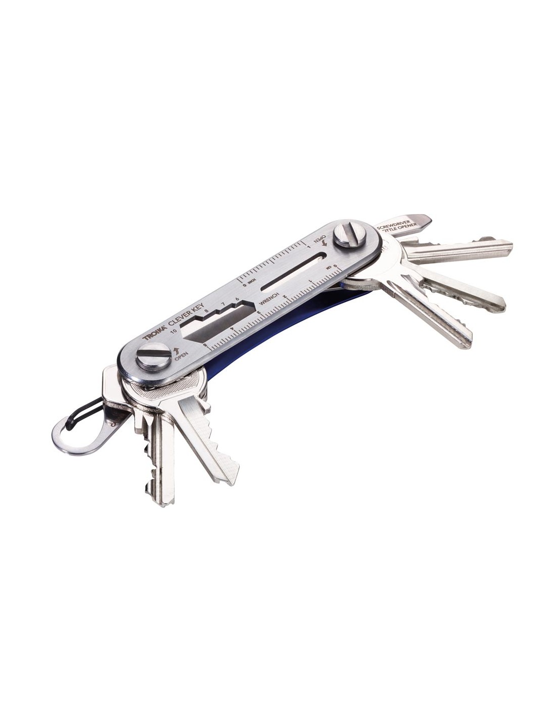 Organisateur de clés pour un maximum de 6 clés, 6 fonctions supplémentaires, ouvre-bouteille, mousqueton, clés à écrou (4 tailles), tournevis plat, outil pour vis à ailettes, règle en centimètres/en pouces, incl. sacoche ceinture, acier inoxydable, aluminium, mat, argenté/bleu