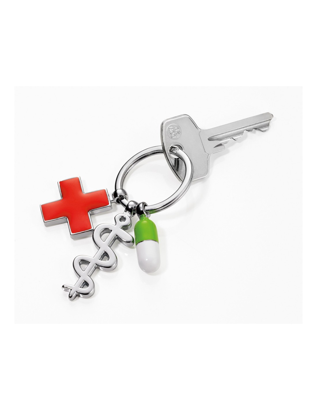 Porte-clés avec 3 breloques, bâton d'Asclépios, croix rouge, pilule, émail, fonte métallique, chrome, brillant, multicolore