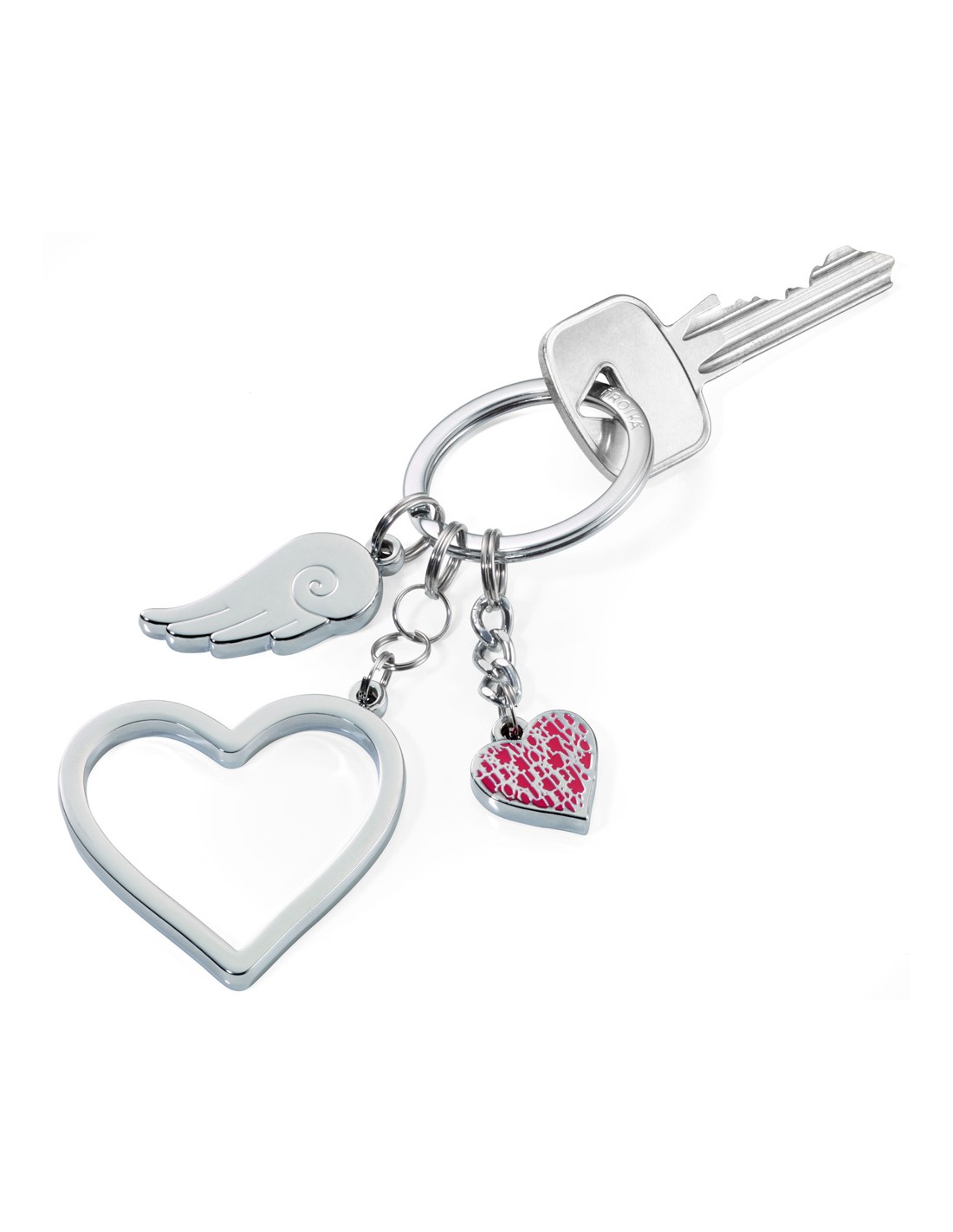 Porte-clés avec 3 breloques, coeur (grand), coeur (petit), ailechrome, brillant, argenté