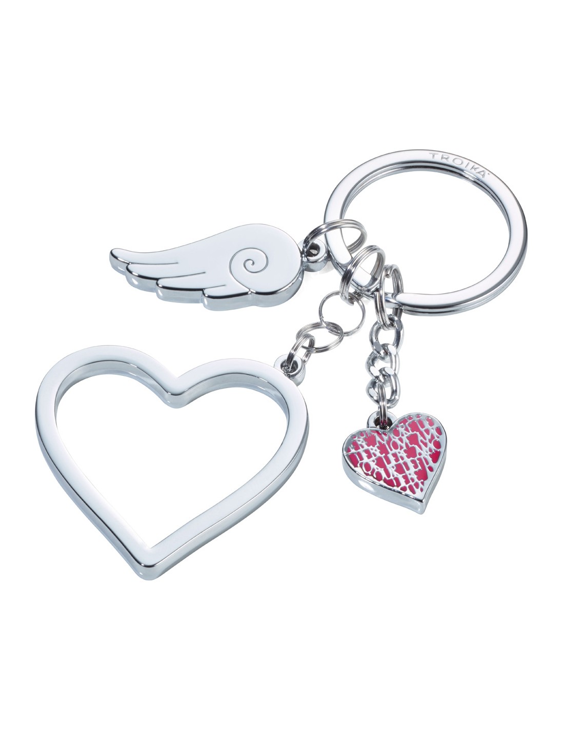 Porte-clés avec 3 breloques, coeur (grand), coeur (petit), aile, émail, fonte métallique, brillant, or rose