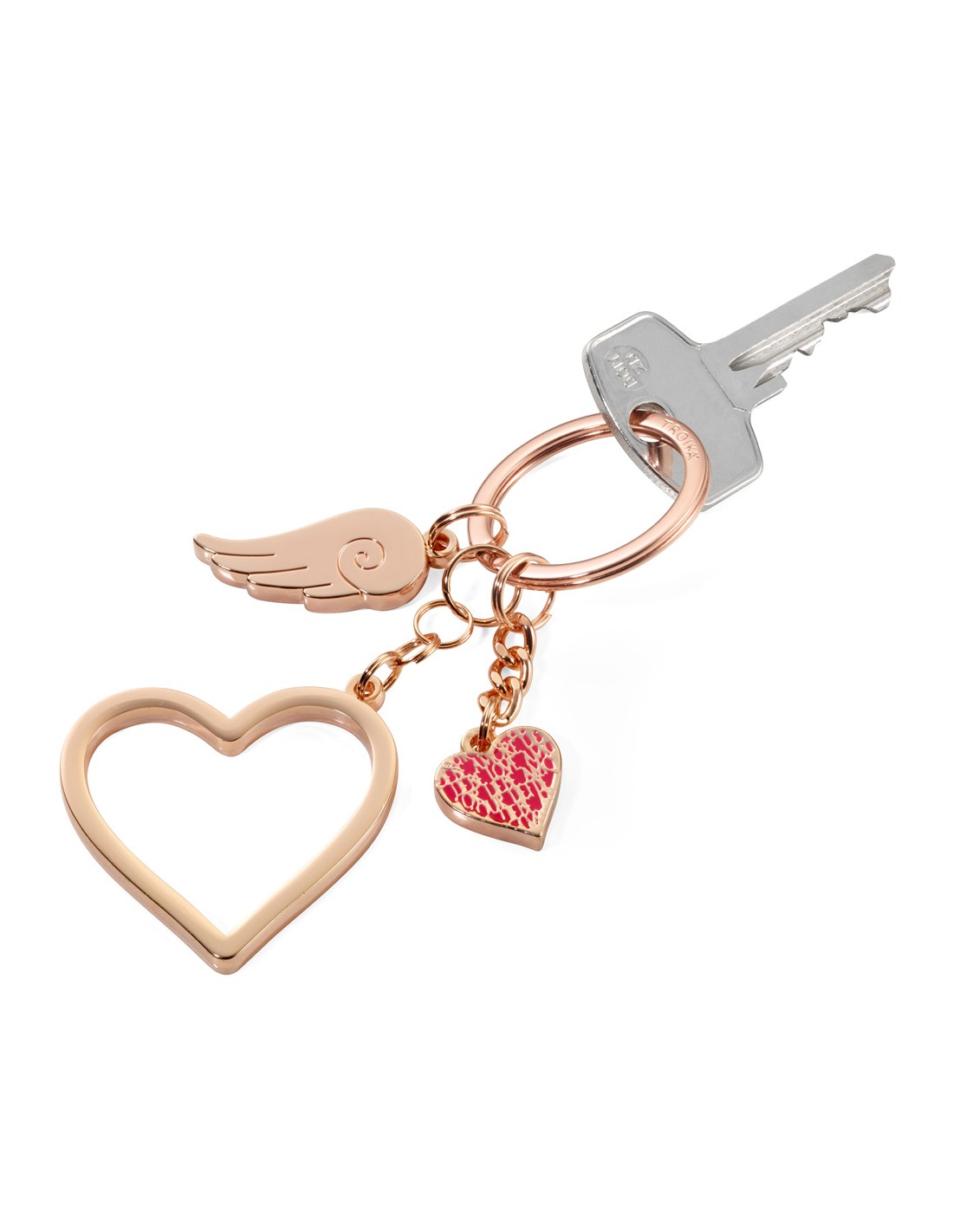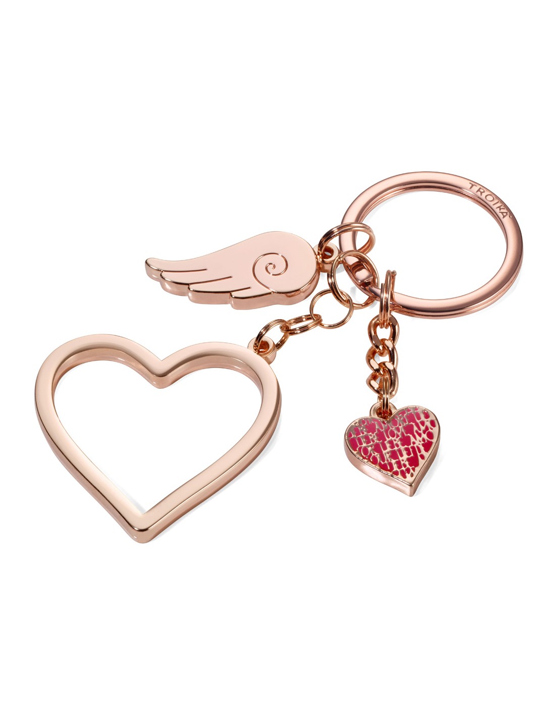 Porte-clés avec 3 breloques, coeur (grand), coeur (petit), aile, émail, fonte métallique, brillant, or rose