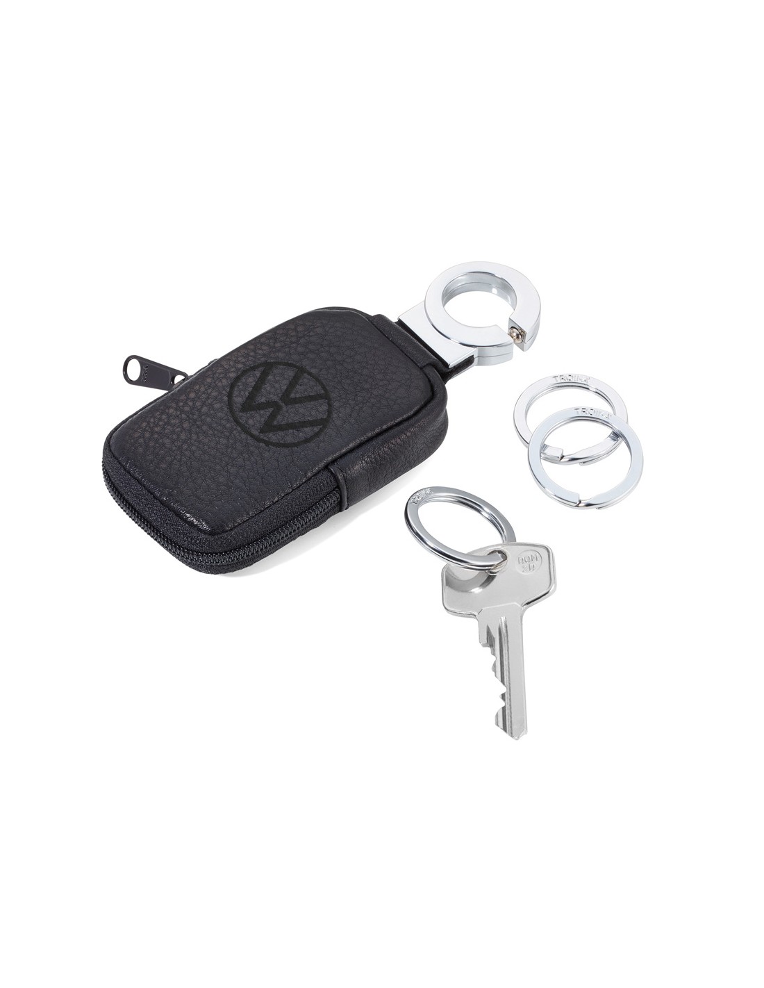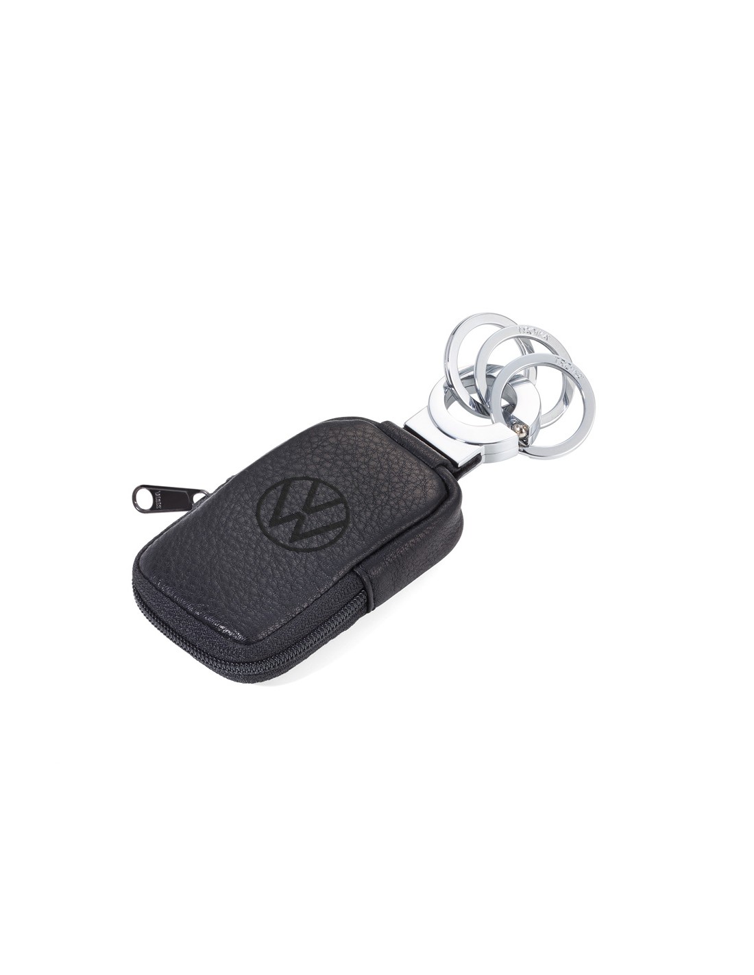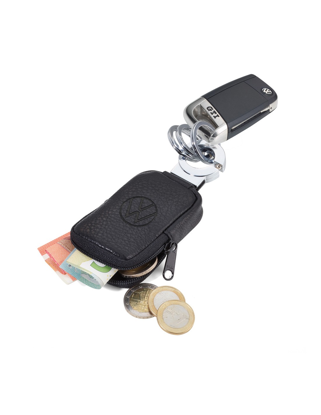 Porte-clés avec pochette pour pièces de monnaie, logo VW gaufré, fermeture zippée, 3 anneaux pour clès, fermoir "clic" pratique, cuir, métal, brillant, argenté/noire