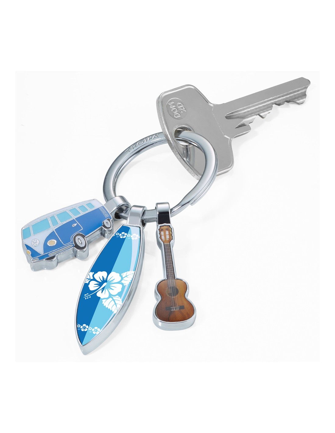 Porte-clés avec 3 breloques, bus VW, planche de surf, guitare, émail, fonte métallique, chrome, brillant, argenté/bleu/multicolore