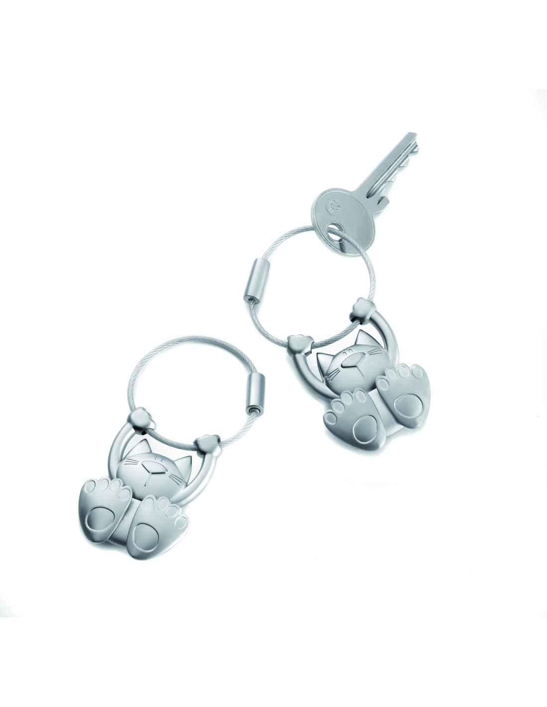 Porte-clés, chat acrobate, fonte métallique, mat, argenté