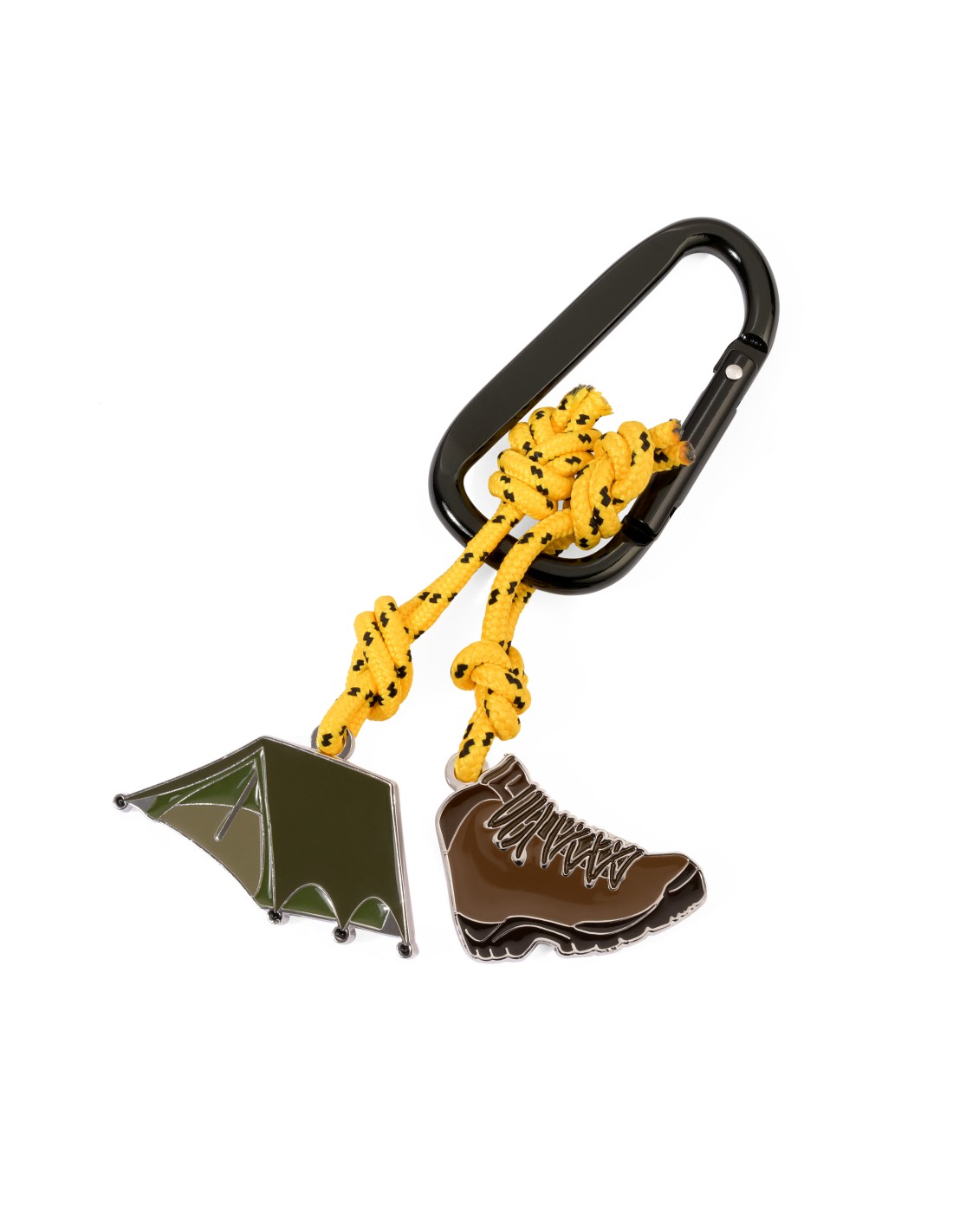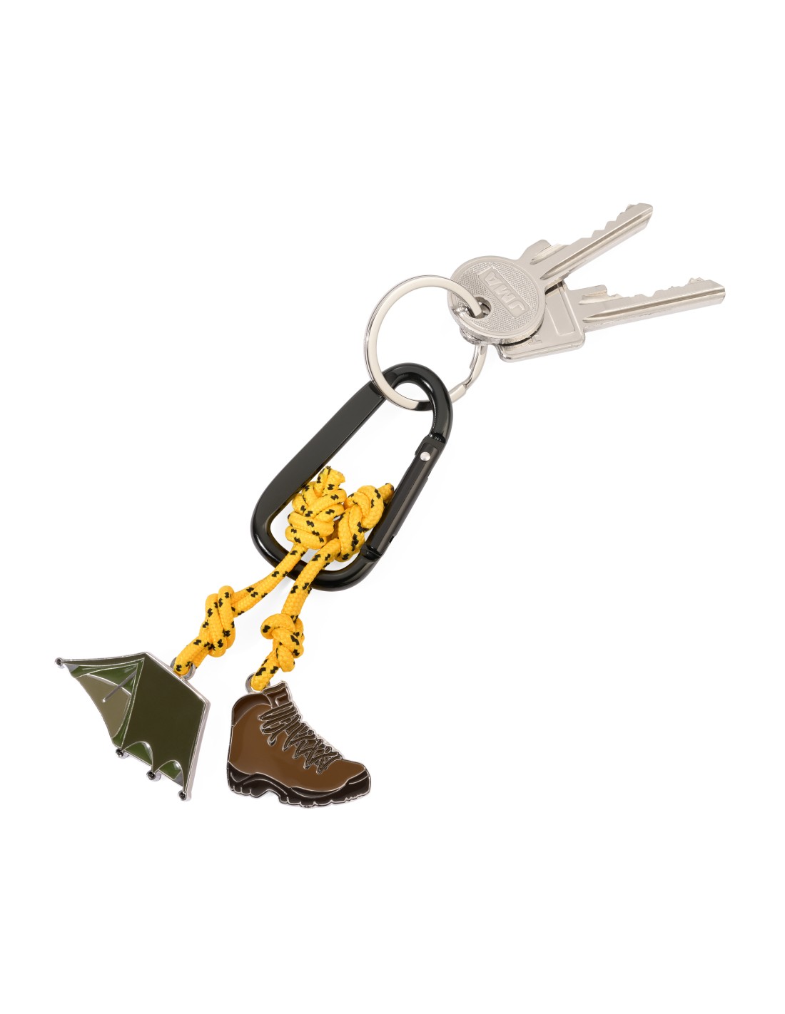 Porte-clés incl. mousqueton, 2 pendentifs sur une corde d'escalade décorative: tente, chaussures de randonnée, aluminium, émail, fonte métallique, nylon, brillant, multicolore